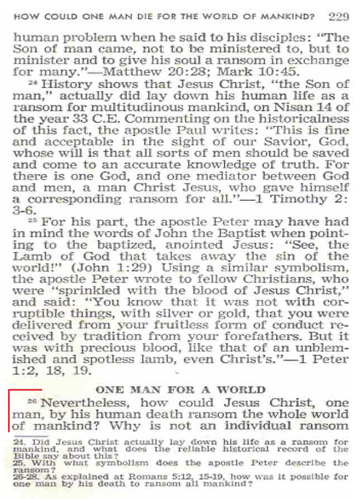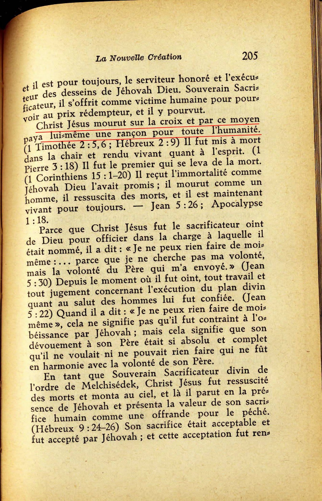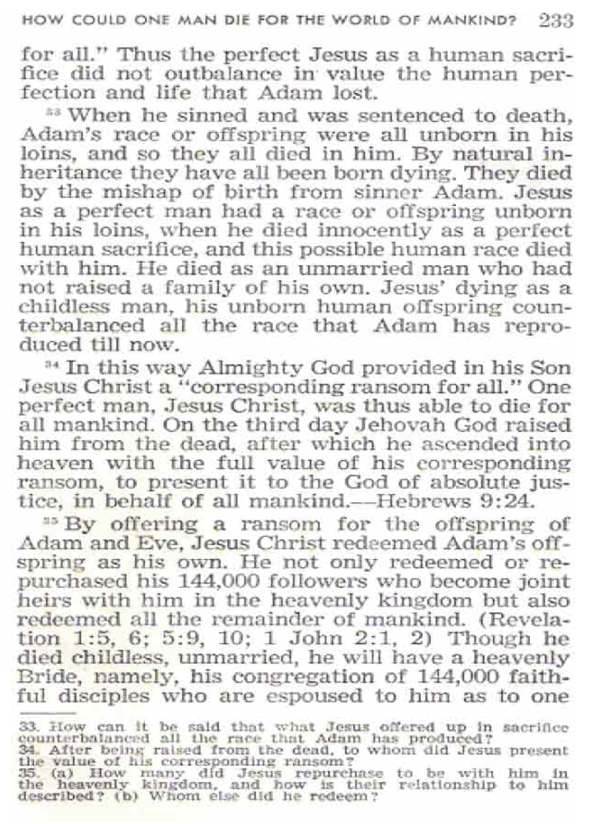 Neverless, how could Jesus Christ, one man, by his human death ransom the whole world of mankind? Why is not a individual ransom sacrifice required for each member of the human family? It was all through the underserved kindness of God, and his wisdom explains it for us briefly, in Romans 5:12, 15-19 [...] That inspired argument balances Jesus Christ, one man, off with Adam, one man. [...] Jesus had been a spirit Son of God in heaven, God's "only-begotten Son." and, in order that his only-begotten Son might be born as a perfect human creature, Almighty God divested the Son of his heavenly godlike existence and transferred his life from heaven to Mary's womb by means of God's invisible active force or spirit. Thus this heavenly Son, who was God's Spokesman or "Word," was developped as a human child for nine months in the womb of his virgin mother, but not inheriting sin, imperfection and death from Mary's original earthly father, Adam. [...] In this way Almighty God provided in his Son Jesus Christ a "corresponding ransom for all." One perfect human, Jesus Christ, was thus able to die for all mankind. On the third day Jehovah God raised him from the dead, after which he ascended into heaven with the full value of his corresponding ransom, to present it to God of absolute justice, in behalf of all mankind. - Hebrews 9:24. By offering a ransom for the offspring of Adam and Eve, Jesus redeemed Adam's offspring as his own. He not only redeemed or repurchased his 144,000 followers who become joint heirs with him in the heavenly kingdom but also redeemed all the remainder of mankind. Source : 🇺🇸 1965 Things in which it is impossible for God to lie page 229, page 230, page 231, page 232, page 233 + Cover |