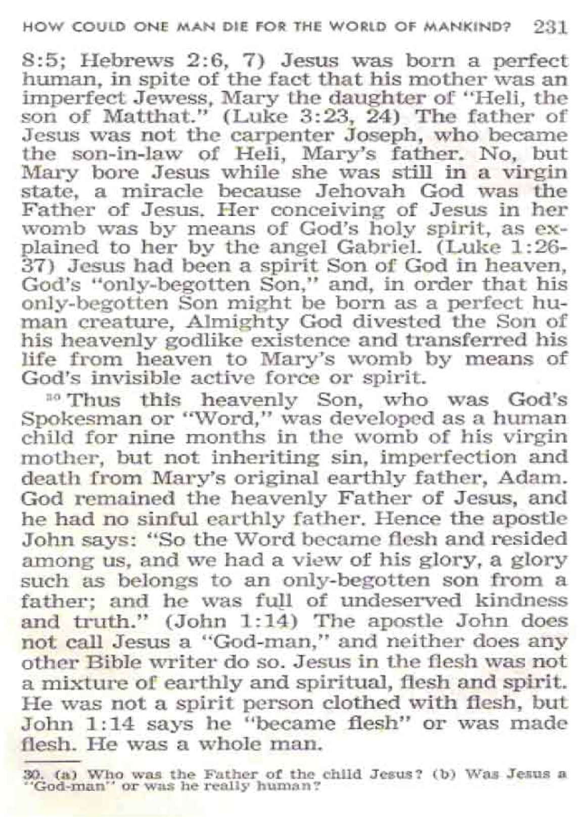 Ainsi, ce Fils céleste, qui était le porte-parole de Dieu ou «Parole», a été développé comme enfant humain pendant neuf mois dans le sein de sa mère vierge, mais n'héritant pas du péché, de l'imperfection et de la mort du père terrestre original de Marie, Adam. [...] De cette manière, le Dieu tout-puissant a fourni à son Fils Jésus-Christ une "rançon adéquat pour tous". Un humain parfait, Jésus-Christ, a ainsi pu mourir pour toute l'humanité. Le troisième jour, Jéhovah Dieu l'a ressuscité d'entre les morts, après quoi il est monté au ciel avec la valeur totale de sa rançon correspondante, pour la présenter à Dieu comme justice absolue, en faveur de toute l'humanité. - Hébreux 9:24.