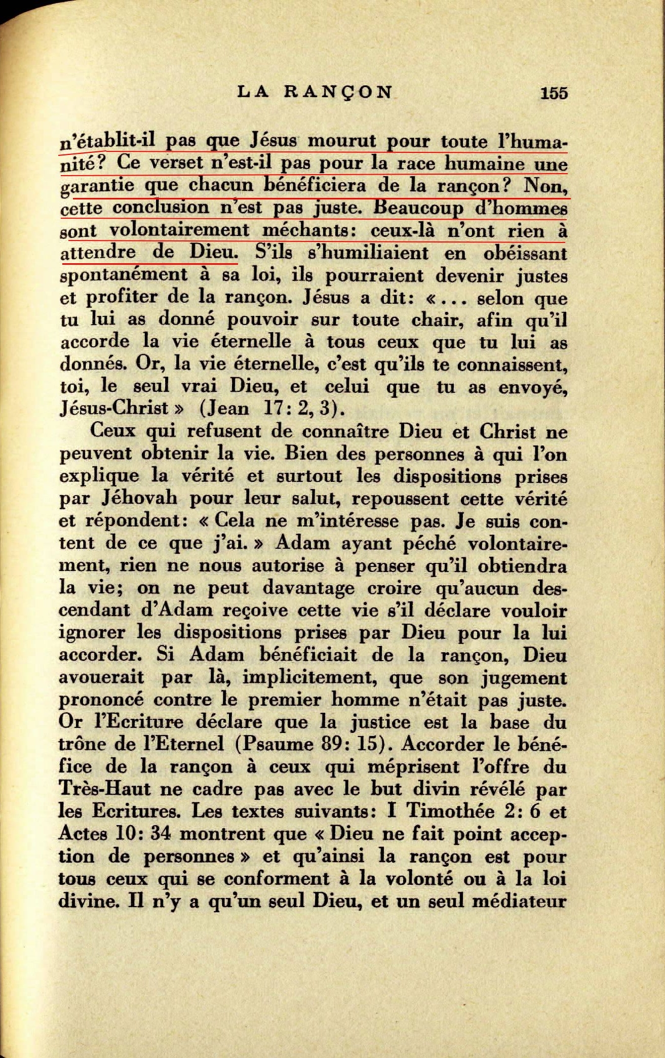 La rançon payée par Jésus n'assure-t-elle pas la vie à tous ? Le texte de 1 Timothée 2:6 cité plus haut n'établit-il pas que Jésus mourut pour toute l'humanité ? Ce verset n'est-il pas pour la race humaine une garantie que chacun bénéficiera de la rançon ? Non, cette conclusion n'est pas juste. Beaucoup d'hommes sont volontairement méchants: ceux-là n'ont rien à attendre de Dieu Source : 🇫🇷 Salut (1939), page 154, page 155 + Cover |
