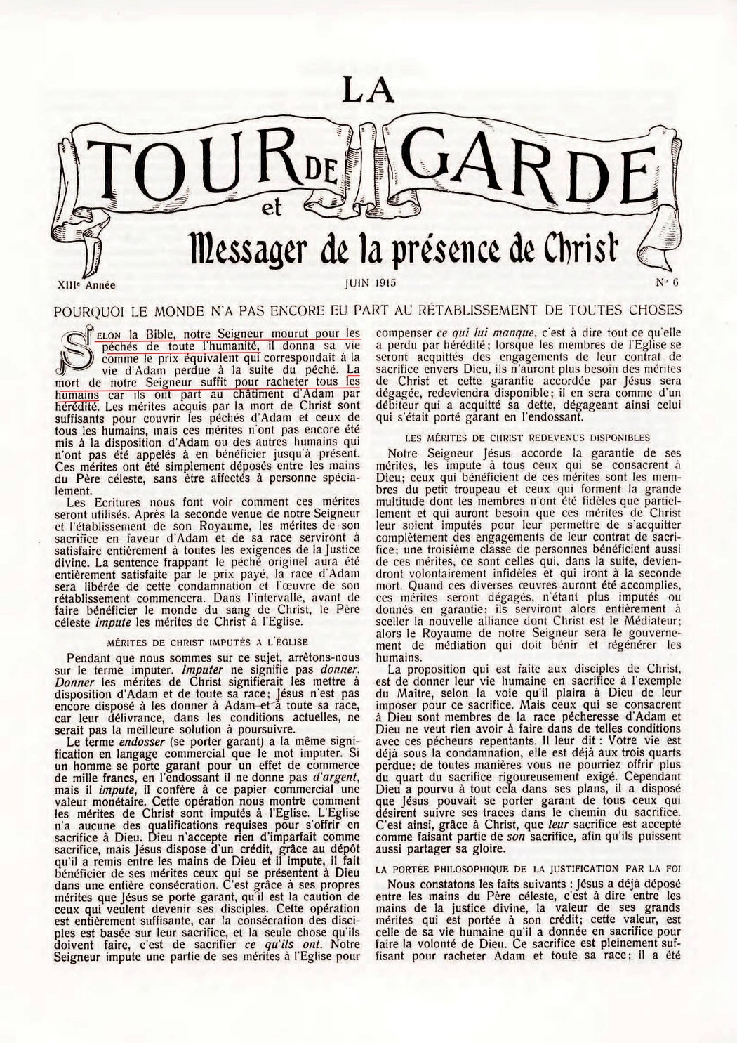 SAVEZ-VOUS que Jésus "est la propitiation [satisfaction] pour nos péchés; et non seulement pour les nôtres [de l'Eglise], mais aussi pour ceux de tout le monde?" - 1 Jean 2:2. Source : 🇫🇷 Le Phare de la Tour de Sion, Novembre 1904, page 87 |