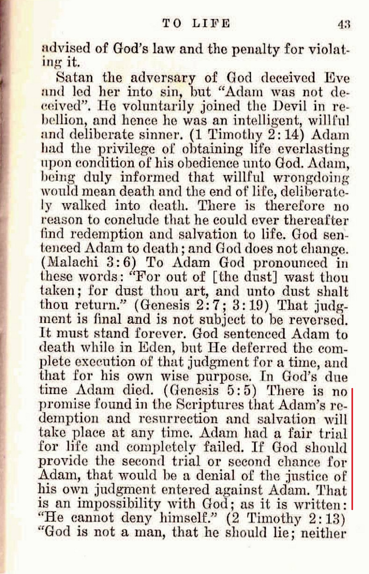 There is not a scrap of evidence that Adam repented. He was a willful rebel and was beyond repentance, and his sentence is beyond recall. [...] Adam died and went nowhere but to the dust from which he had been taken.