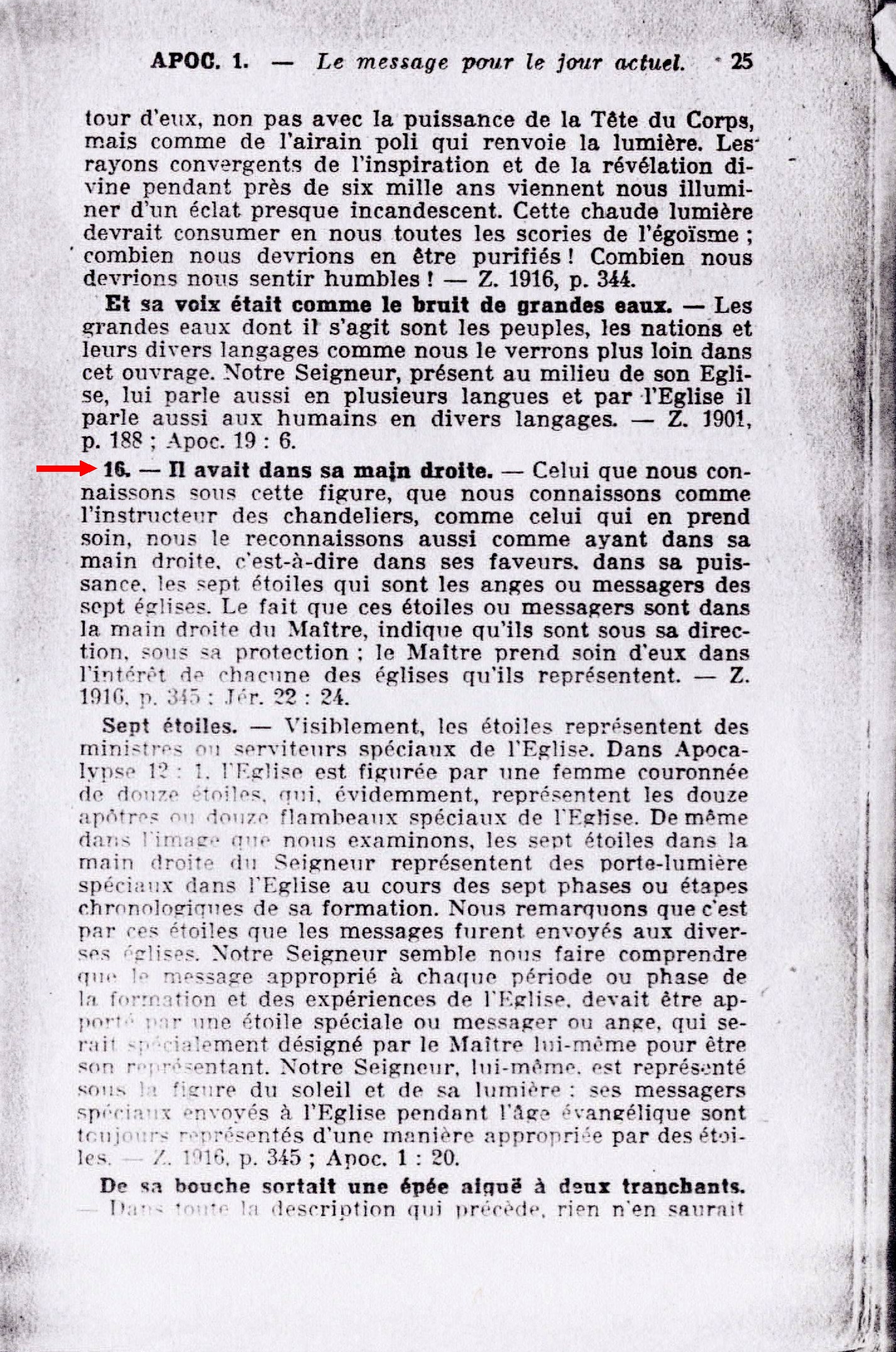 Il avait dans sa main droite. - Celui que nous connaissons sous cette figure, que nous connaissons comme l'instructeur des chandeliers, comme celui qui en prend soin, nous le reconnaissons aussi comme ayant dans sa main droite, c'est-à-dire dans ses faveurs. dans sa puissance les sept étoiles qui sont les anges ou messagers des sept églises. le fait que ces étoiles ou messagers sont dans la main droite du Maître, indique qu'ils sont sous sa direction, sous sa protection ; le Maître prend soin d'eux dans l'intérêt de chacune des églises qu'ils représentent... Sept étoiles. - Visiblement, les étoiles représentent des ministres ou serviteurs spéciaux de l'Eglise... dans l'image que nous examinons, les sept étoiles dans la main droite du seigneur représentent des porte-lumière spéciaux dans l'Eglise au cours des sept phases ou étapes chronologiques de sa formation. Nous remarquons que c'est par ces étoiles que les messagers furent envoyés aux diverses églises. Notre Seigneur semble nous faire comprendre que le message approprié à chaque période ou phase de la formation et des expériences de l'Eglise, devait être apporté par une étoile spéciale ou messager ou ange, qui serait spécialement désigné par le Maître lui-même pour être son représentant. Notre Seigneur lui-même, est représenté sous la figure du soleil et de sa lumière : ses messagers spéciaux envoyés à l'Eglise pendant l'âge évangélique sont toujours représentés d'une manière appropriée par des étoiles... Source : 🇫🇷 1917 - Etudes des écritures, vol 7, le Mystère Accompli, page 25 + Cover |