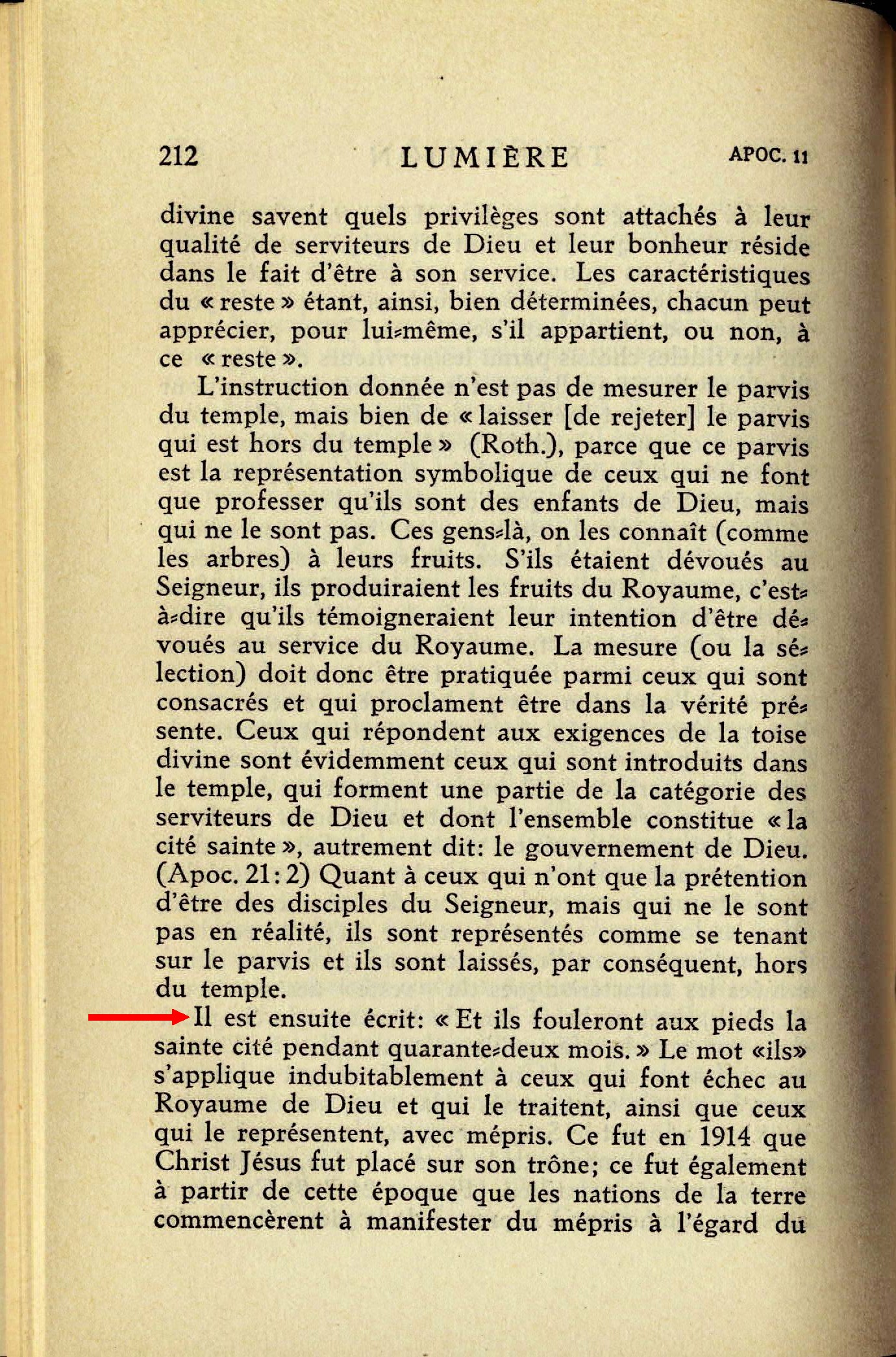 Il est ensuite écrit: "Et ils fouleront aux pieds la sainte cité pendant quarante-deux mois". Le mot "ils" s'applique indubitablement à ceux qui font échec au Royaume de Dieu et qui le traitent, ainsi que ceux qui le représentent, avec mépris. Ce fut en 1914 que Christ Jésus fut placé sur son trône; ce fut également à partir de cette époque que les nations de la terre commencèrent à manifester du mépris à l'égard du nouveau gouvernement de Christ et à le fouler figurativement aux pieds. C'est donc en l'année 1914 que l'humanité a inauguré cette attitude contemptrice, pour la raison qu'il devait en être ainsi peu de temps après la prise de possession, par le Seigneur, de son pouvoir et de son règne. Les "quarante-deux mois" de piétinement font 1260 jours et ce laps de temps est précisément le même que les 1260 jours pendant lesquels prophétiseront les "deux témoins" vétus de sacs. Source : 🇫🇷 1930 - Lumière, vol 1, page 212, page 213 + Cover |
