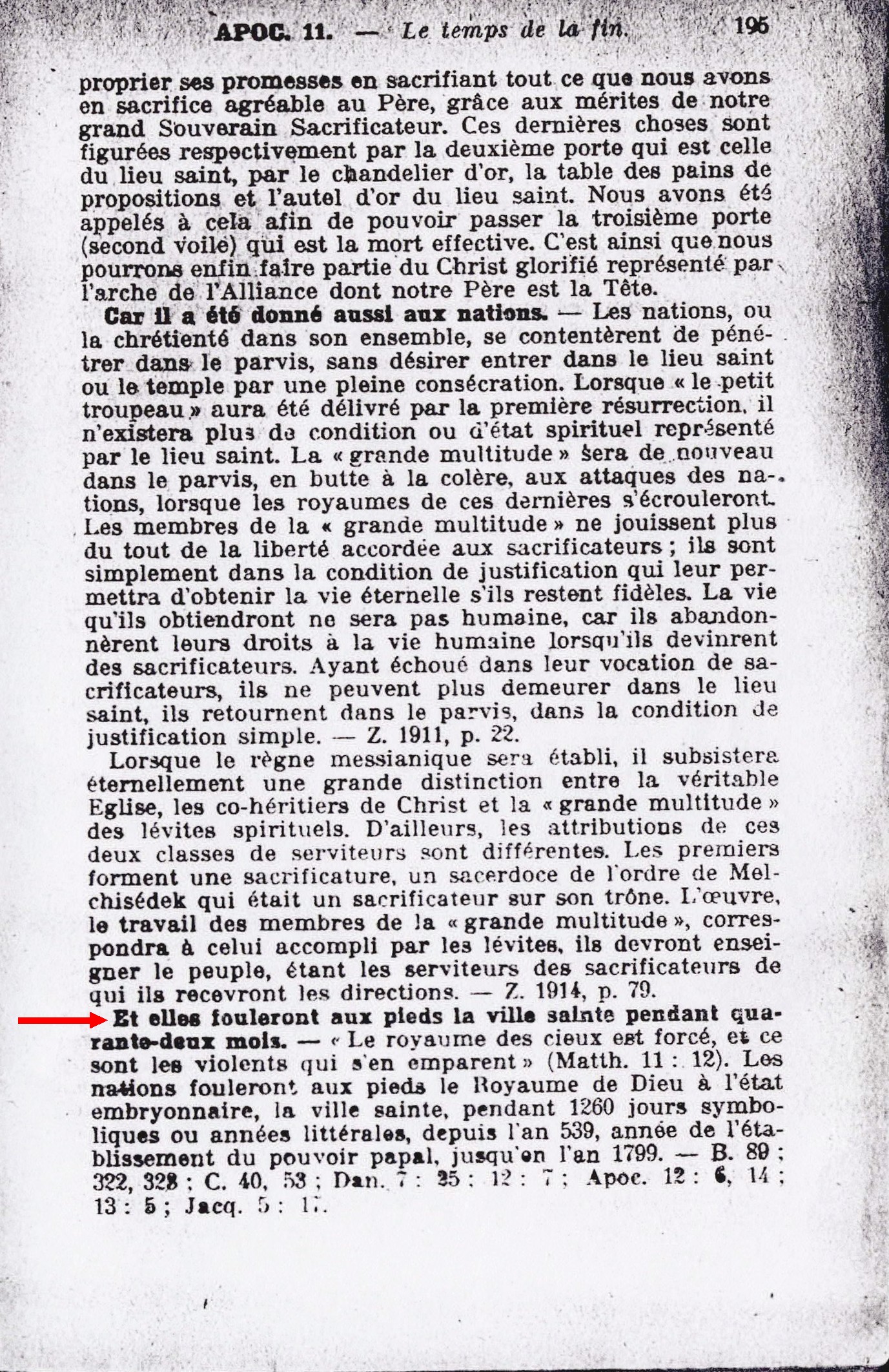 Et elles fouleront aux pieds la ville sainte pendant quarante-deux-mois. "Le royaume des cieux est forcé, et ce sont les violents qui s'en emparent" (Matth. 11:12). Les nations fouleront aux pieds le Royaume de Dieu à l'état embryonnaire, la ville sainte, pendant 1260 jours symboliques ou années littérales, depuis l'an 539, année de l'établissement du pouvoir papal, jusqu'en l'an 1799. Source : 🇫🇷 1917 - Le Mystère Accompli, page 195 + Cover |