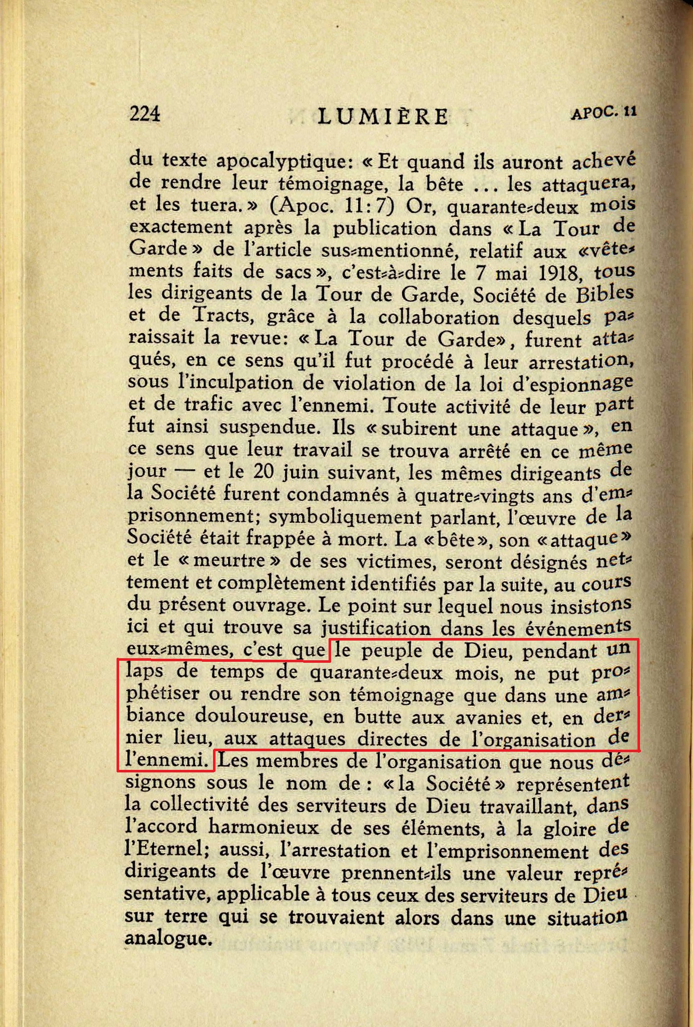 L'époque L'article publié dans l'édition du 1 er novembre de "La Tour de Garde" fut entre les mains de ses lecteurs vers la fin de la première semaine de ce mois, le 7 novembre 1914 environ. Il dépeint les serviteurs de Dieu, appartenant à la catégorie d'Elie, comme vêtus de sacs. [...] "Ils prophétiseront" (ils rendront témoignage en dépit de l'humiliante condition où ils se trouvent) pendant 1260 jours, ou quarante-deux mois, [...] (Apocalypse 11:2,3) Dès le début de la Guerre Mondiale, en 1914, les Etudiants de la Bible, que nous désignons dans cet ouvrage sous la dénomination de "peuple de Dieu", furent "haïs par toutes les nations", ainsi que l'avait annoncé Jésus. (Matth. 24:9) Ils furent ainsi foulés aux pieds, méprisés et traités avec mépris. Quarante-deux mois de trente jours chacun, soit 1260 jours, ce laps de temps, équivalent à trois années solaires et demie, commencera dans la première semaine de novembre, soit le 7 novembre 1914, pour prendre fin le 7 mai 1918. [...] Le point sur lequel nous insistons ici et qui trouve sa justification dans les événements eux-mêmes, c'est que le peuple de Dieu; pendant un laps de temps de quarante-deux mois, ne put prophétiser ou rendre son témoignage que dans une ambiance douloureuse, en butte aux avanies et, en dernier lieu, aux attaques directes de l'organisation de l'ennemi. Source : 🇫🇷 1930 - Lumière, vol 1, page 223, page 224 + Cover |