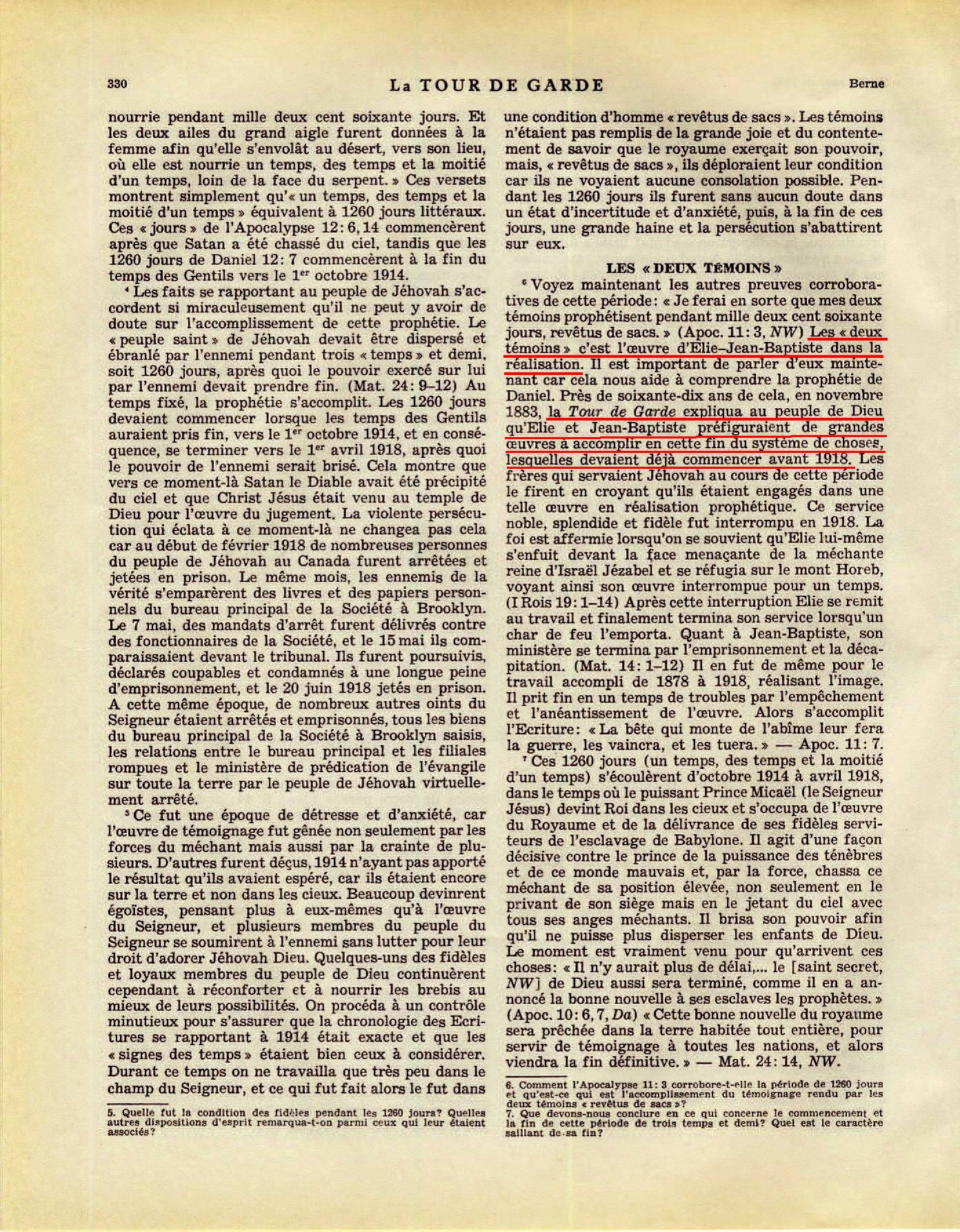 Voyez maintenant les autres preuves corroboratives de cette période: "Je ferai en sorte que mes deux témoins prophétisent pendant mille deux cent soixante jours, revêtus de sacs." (Apoc. 11:3, NW) Les "deux témoins" c'est l'oeuvre d'Elie-Jean Baptiste dans la réalisation. Il est important de parler d'eux maintenant car cela nous aide à comprendre la prophétie de Daniel. Près de soixante-dix ans de cela, en Novembre 1883, la Tour de Garde expliqua au peuple de Dieu qu'Elie et Jean Baptiste préfiguraient de grandes oeuvres à accomplir en cette fin du système de choses, lesquelles devaient déjà commencer avant 1918. Source : 🇫🇷 La Tour de Garde, 1er Novembre 1951, page 330 + Cover |