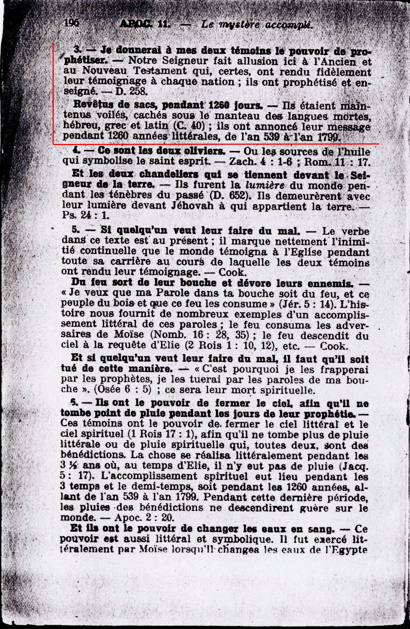 3. - Je donnerai à mes deux témoins le pouvoir de prophétiser. - Notre Seigneur fait allusion ici à l'Ancien et au Nouveau Testament qui, certes, ont rendu fidèlement leur témoignage à chaque nation; ils ont prophétisé et enseigné. Revêtus de sacs, pendant 1260 jours - Ils étaient maintenus voilés, cachés sous le manteau des langues mortes, hébreu, grec et latin (C40); Ils ont annoncé leur message pendant 1260 années littérales, de l'an 539 à l'an 1799. Source : 🇫🇷 1917 - Le Mystère Accompli, page 196 + Cover |