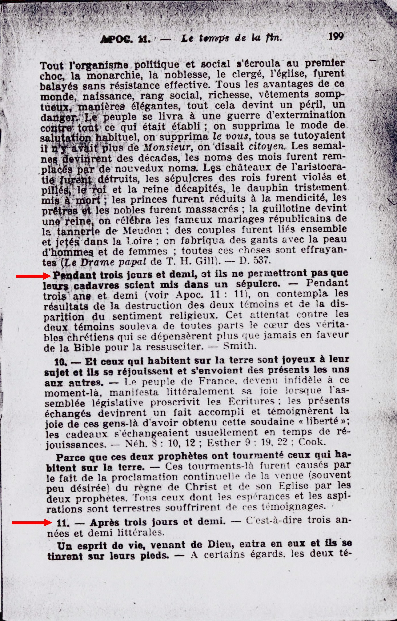 Pendant trois jours et demi, et ils ne permettront pas que leurs cadavres soient mis dans un sépulcre. - Pendant trois ans et demi (voir Apoc. 11:11), on contempla les résultats de la destruction des deux témoins et de la disparition du sentiment religieux. Cet attentat contre les deux témoins souleva de toutes parts le coeur des véritables chrétiens qui se dépensèrent plus que jamais en faveur de la Bible pour la ressusciter. - Smith [...]