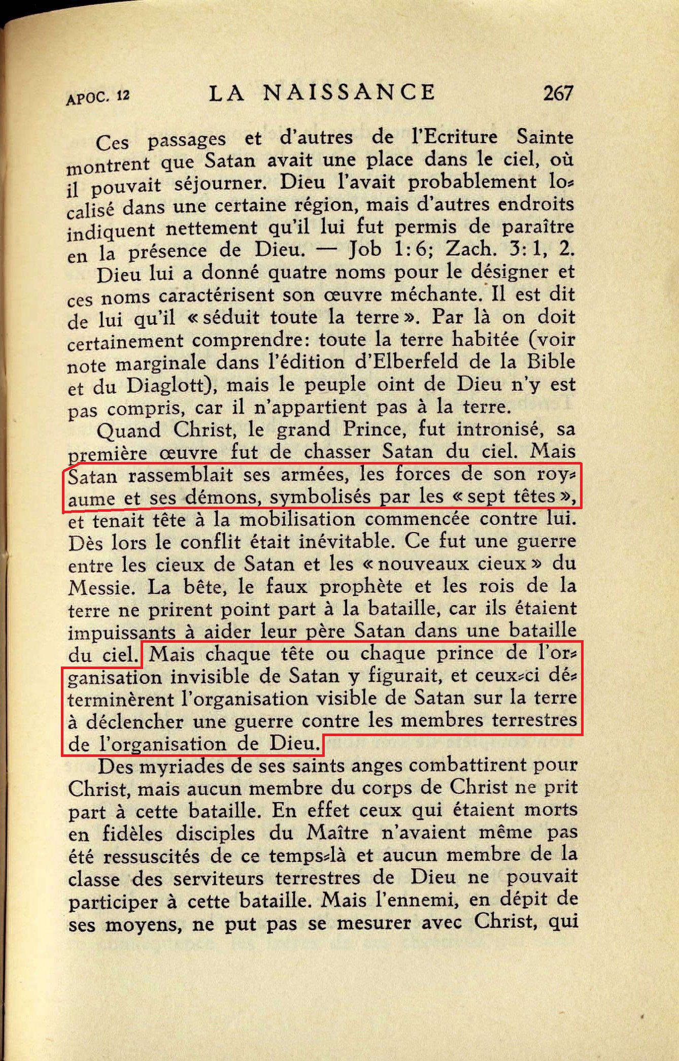 Satan rassemblait ses armées, les forces de son royaume et ses démons, symbolisés par les "sept têtes", et tenait tête à la mobilisation commencée contre lui [...] Mais chaque tête ou chaque prince de l'organisation invisible de Satan y figurait, et ceux-ci déterminèrent l'organisation visible de Satan sur la terre à déclencher une guerre contre les membres terrestres de l'organisation de Dieu.