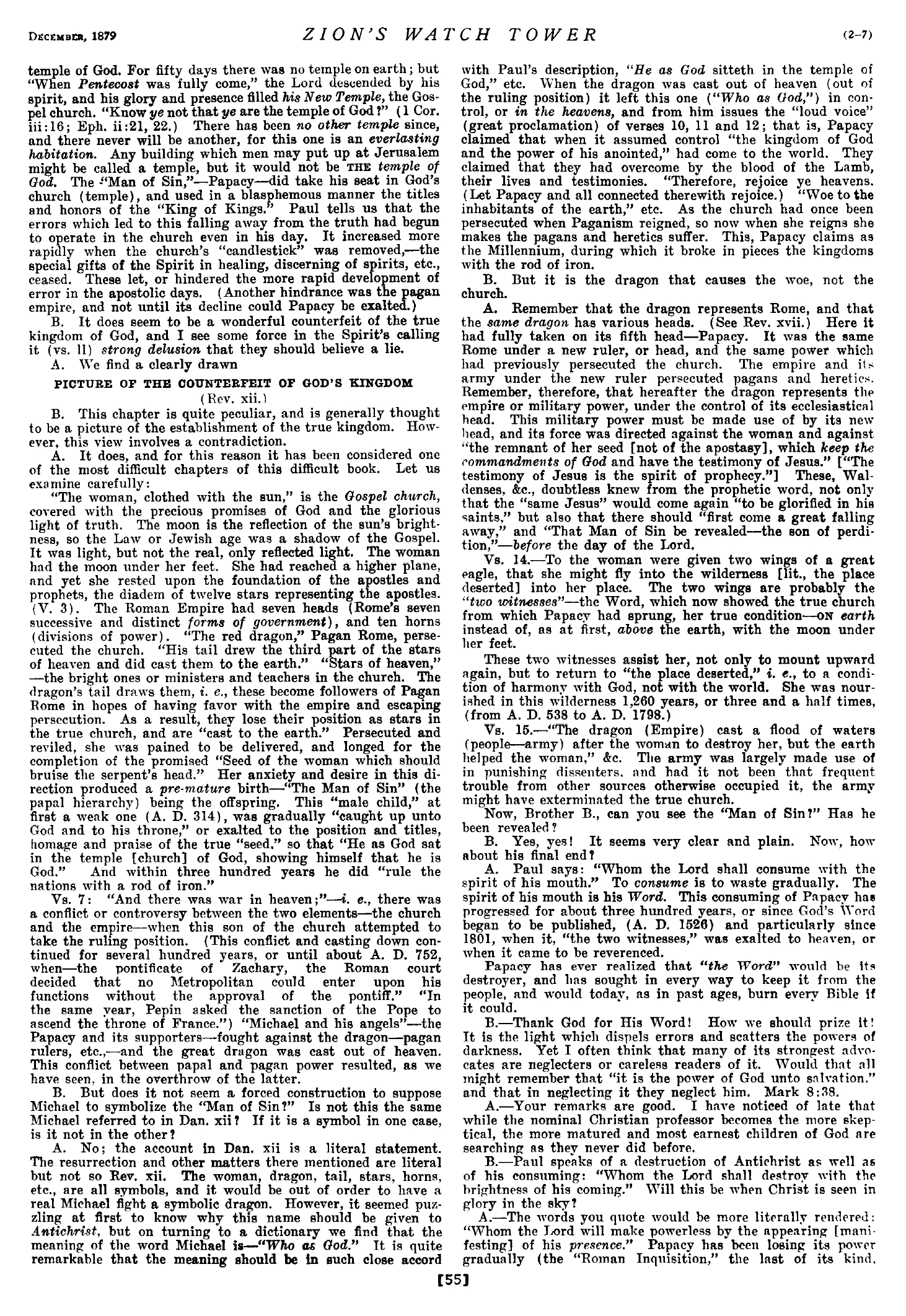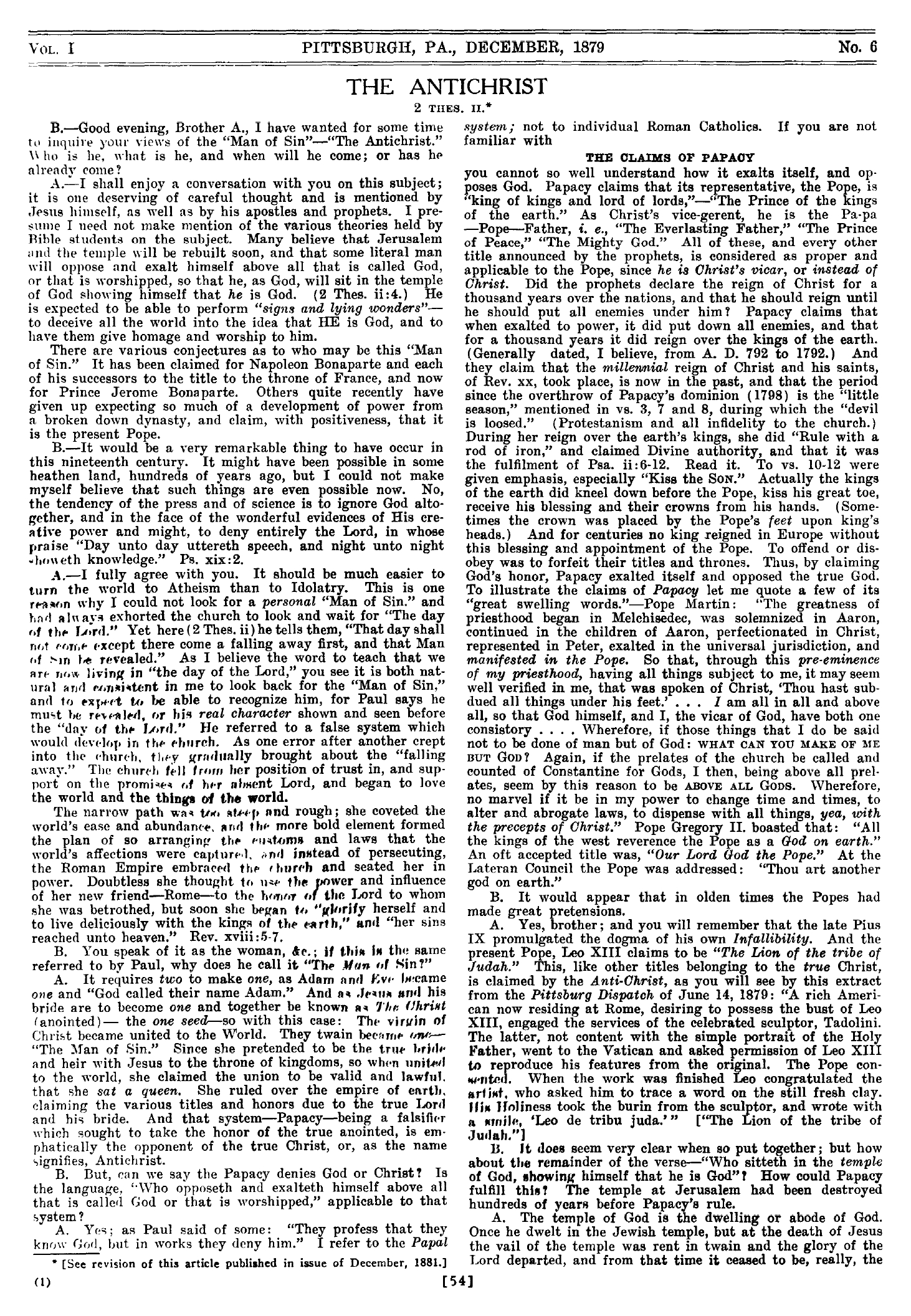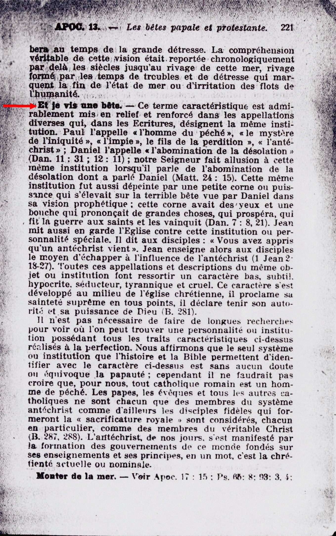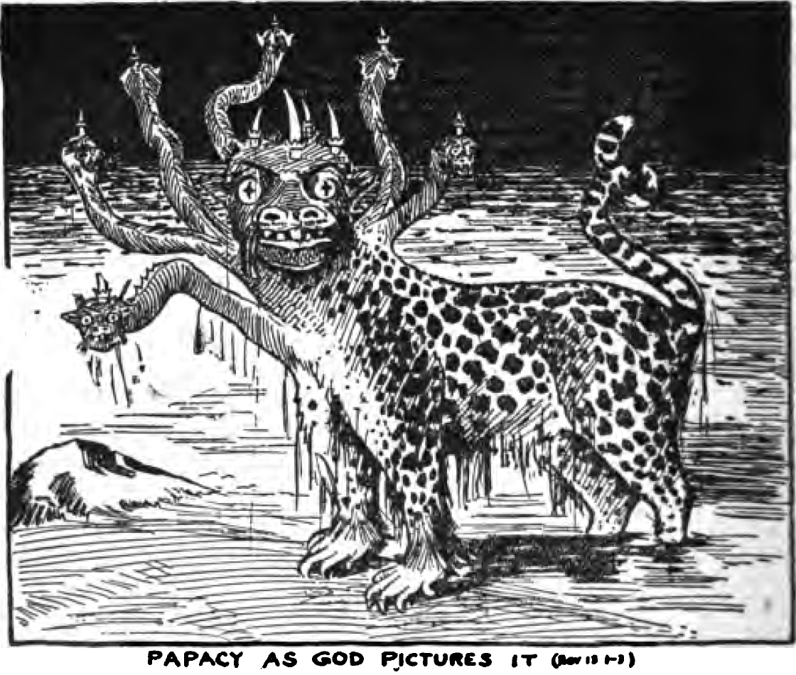 Et je vis un bête. - Ce terme caractéristique est admirablement mis en relief et renforcé dans les appellations diverses qui, dans les Ecritures, désignent la même institution. Paul l'appelle "l'homme du péché", "le mystère de l'iniquité", "l'impie", "le fils de la perdition", "l'antéchrist"; Daniel l'appelle "l'abomination de la désolation" (Dan. 11:31 ; 12:11); notre Seigneur fait allusion à cette même institution lorsqu'il parle de l'abomination de la désolation dont a parlé Daniel (Matt. 24:15). Cette même institution fut aussi dépeinte par une petite corne ou puissance qui s'élevait sur la terrible bête vue par Daniel dans sa vision prophétique; [...] Jean mit aussi en garde l'Eglise contre cette institution ou personnalité spéciale. [...] Toutes ces appellations et descriptions du même objet ou institution font ressortir un caractère bas, subtil, hypocrite, séducteur, tyrannique et cruel. Ce caractère s'est développé au milieu de l'église chrétienne, il proclame sa sainteté suprême en tous points, il déclare tenir son autorité et sa puissance de Dieu (B. 281). Il n'est pas nécessaire de faire de longues recherches pour voir où l'on peut trouver une personnalité ou institution possédant tous les traits caractéristiques ci-dessus réalisés à la perfection. Nous affirmons que le seul système ou institution que l'histoire et la Bible permettent d'identifier avec le caractère ci-dessus est sans aucun doute ou équivoque la papauté: cependant il ne faudrait pas croire que, pour nous, tout catholique romain est un homme de péché. Les papes, les évêques et tous les autres catholiques ne sont chacun que des membres du système antéchrist comme d'ailleurs les disciples fidèles qui formeront la "sacrificature royale" sont considérés, chacun en particulier, comme des membres du véritable Christ (B. 287, 288). L'antéchrist, de nos jours, s'est manifesté par la formation des gouvernements de ce monde fondés sur ses enseignements et ses principes, en un mot, c'est la chrétienté actuelle nominale. Source : 🇫🇷 1917 - Le Mystere Accompli, page 221 + Cover |