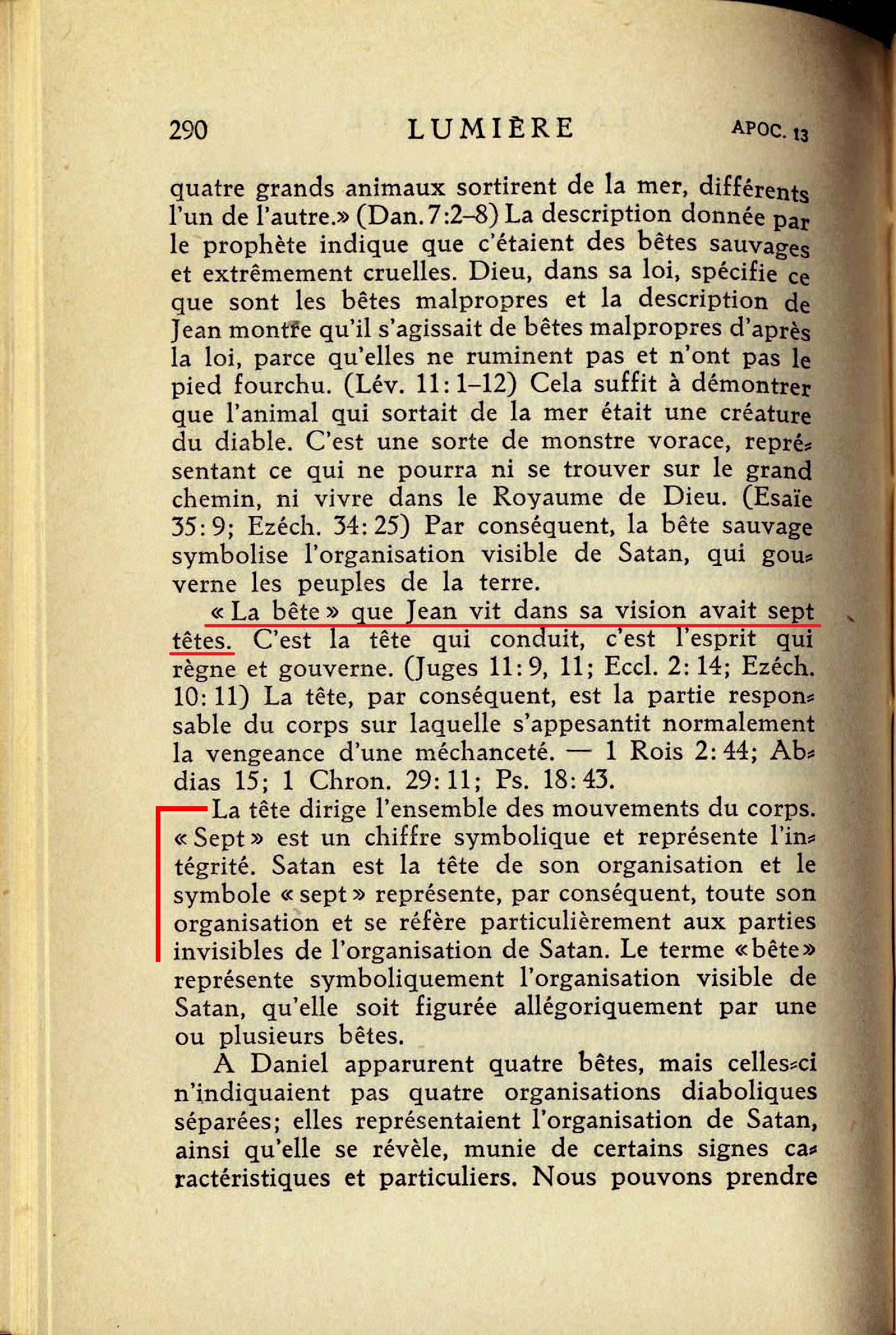 "La bête" que Jean vit dans sa vision avait sept têtes. [...] La tête dirige l'ensemble des mouvements du corps. "Sept" est un chiffre symbolique et représente l'intégrité. Satan est la tête de son organisation et le symbole "sept" représente, par conséquent, toute son organisation et se réfère particulièrement aux parties invisibles de l'organisation de Satan.