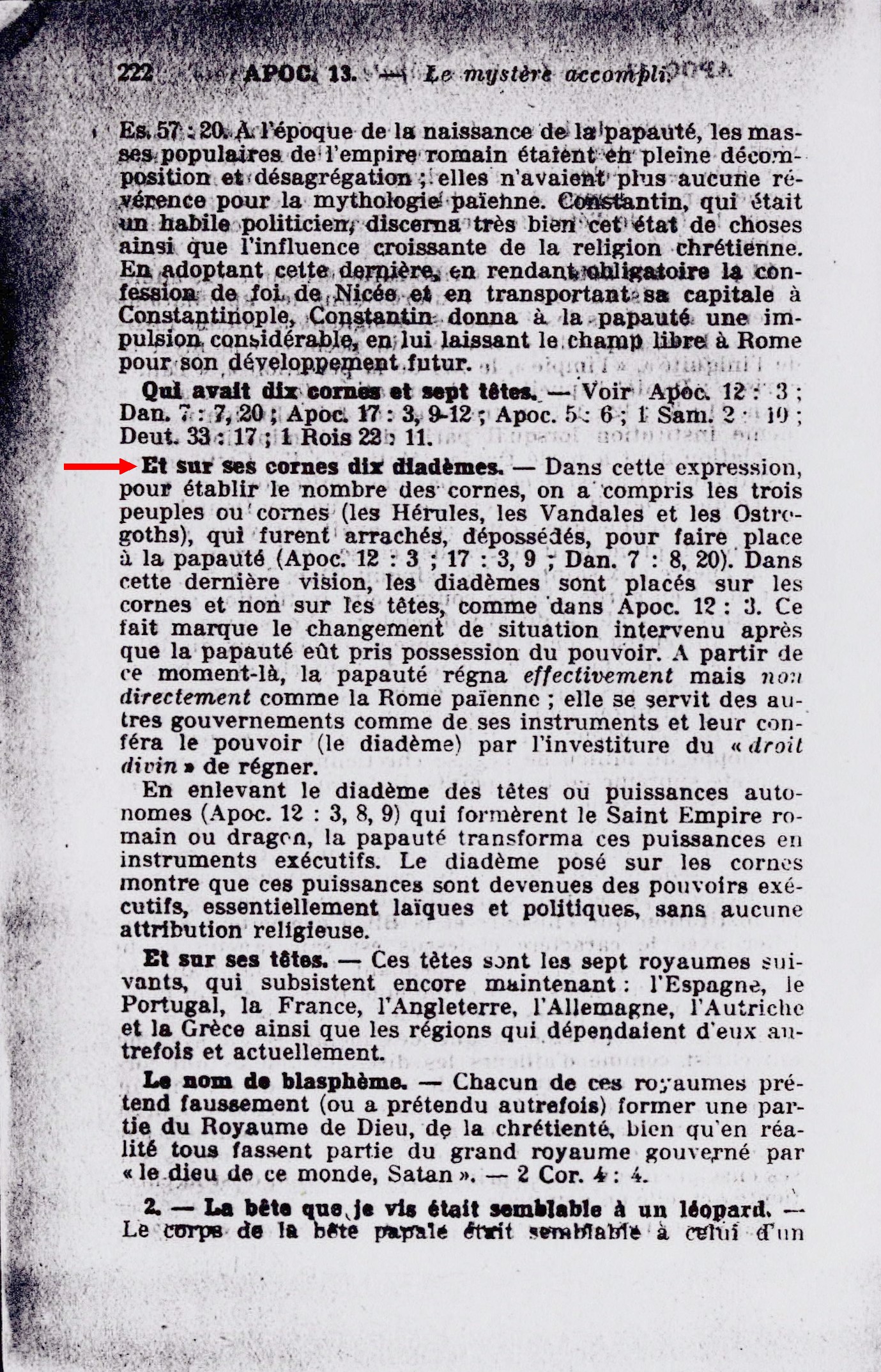Et sur ses cornes dix diadèmes. - Dans cette expression, pour établir le nombre des cornes, on a compris les trois peuples ou cornes (les Hérules, les Vandales et les Ostrogothes), qui furent arrachés, dépossédés, pour faire place à la papauté (Apoc. 12:3; 17:3,9; Dan. 7:8, 20). Dans cette dernière vision, les diadèmes sont placés sur les cornes et non sur les têtes, comme dans Apoc. 12:3. Ce fait marque le changement de situation intervenu après que la papauté eût pris possession du pouvoir. A partir de ce moment-là, la papauté régna effectivement mais non directement comme la Rome païenne; elle se servit des autres gouvernements comme de ses instruments et leur conféra le pouvoir (le diadème) par l'investiture de "droit divin" de régner. En enlevant le diadème des têtes ou puissances autonomes (Apoc. 12:3, 8, 9) qui formèrent le saint Empire romain ou dragon, la papauté transforma ces puissances en instruments exécutifs. Le diadème posé sur les cornes montre que ces puissances sont devenues des pouvoirs exécutifs, essentiellement laïques et politiques, sans aucune attribution religieuse. Source : 🇫🇷 1917 - Le Mystere Accompli, page 222 + Cover |
