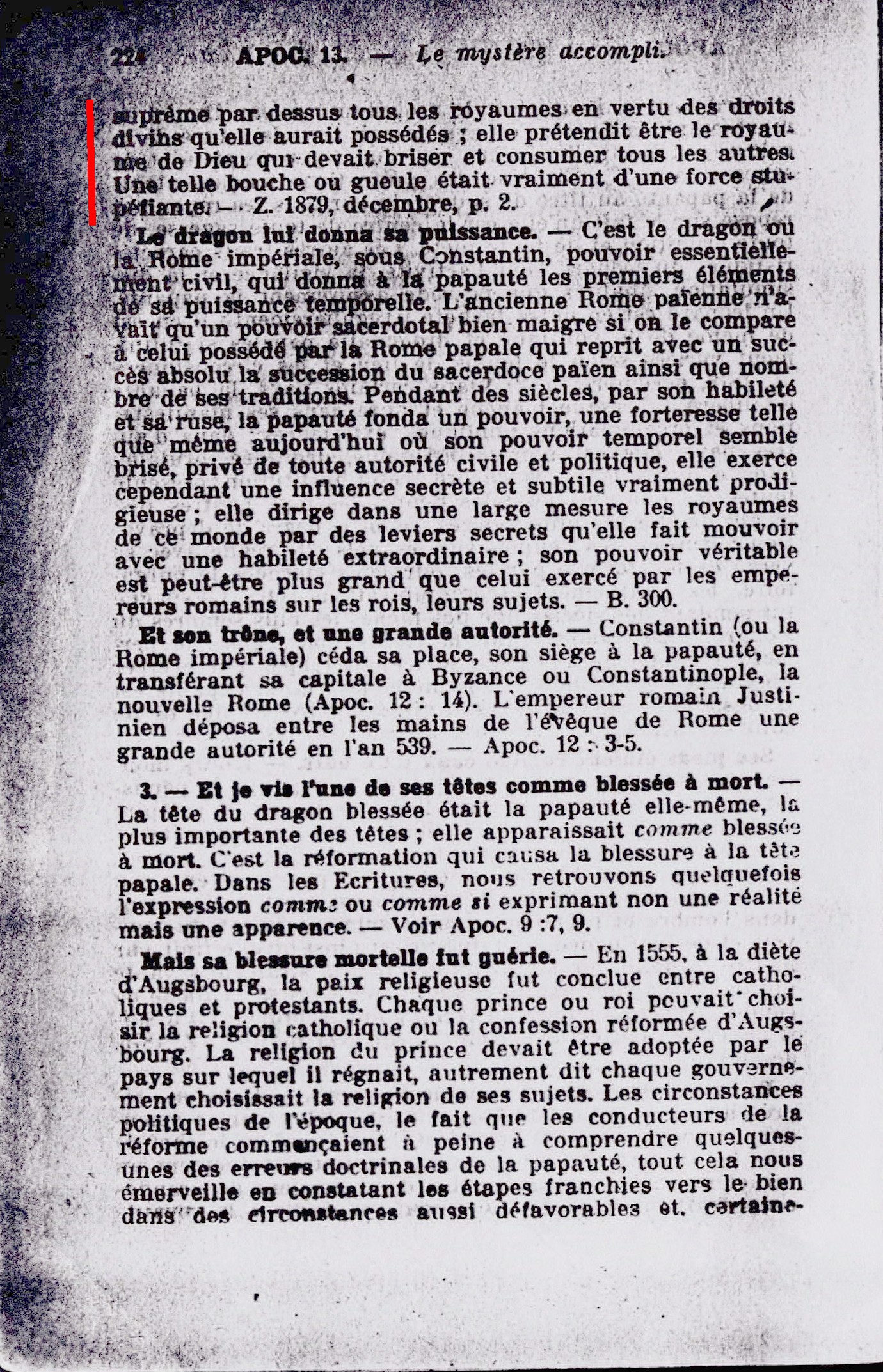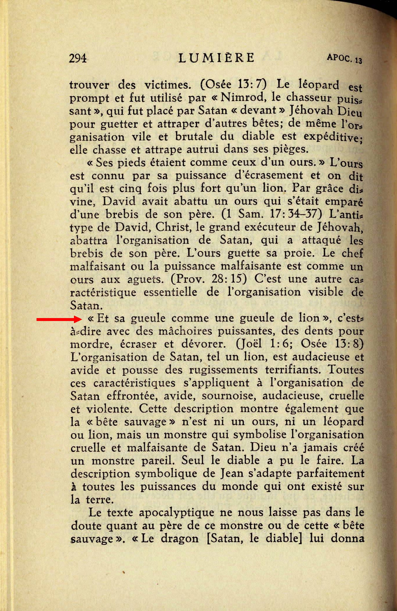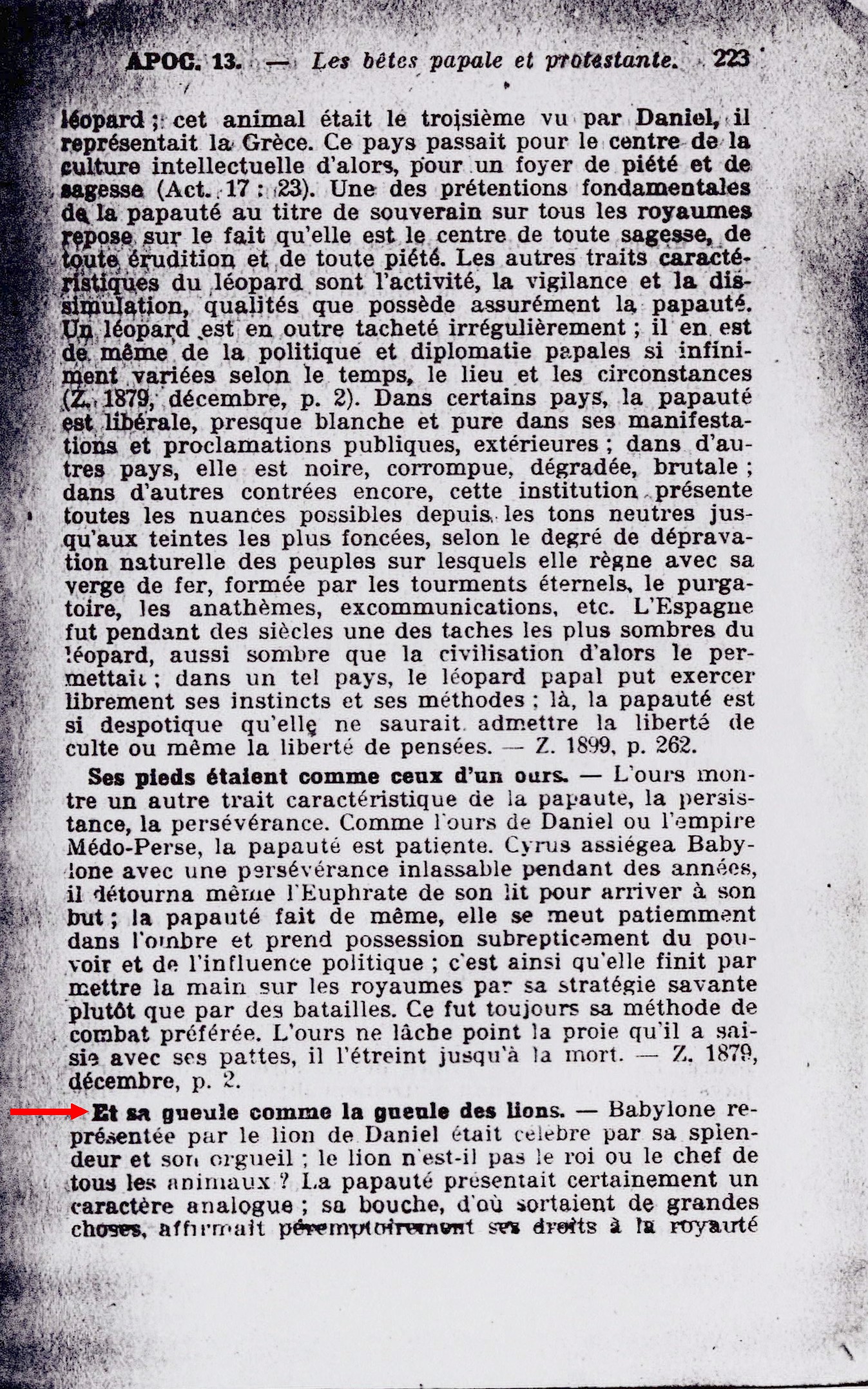 Et sa gueule comme la gueule des lions. - Babylone représentée par le lion de Daniel était célèbre par sa splendeur et son orgueil : le lion n'est-il pas le roi ou le chef de tous les animaux ? La papauté présentait certainement un caractère analogue ; sa bouche, d'où sortaient de grandes choses, affirmait péremptoirement ses droits à la royauté suprême par dessus tous les royaumes en vertu des droits divins qu'elle aurait possédés ; elle prétendit être le royaume de Dieu qui devait briser et consumer tous les autres. Une telle bouche ou gueule était vraiment d'une force stupéfiante. - Z. 1879, décembre, p2. Source : 🇫🇷 1917 - Le Mystere Accompli, page 223, page 224 + Cover |