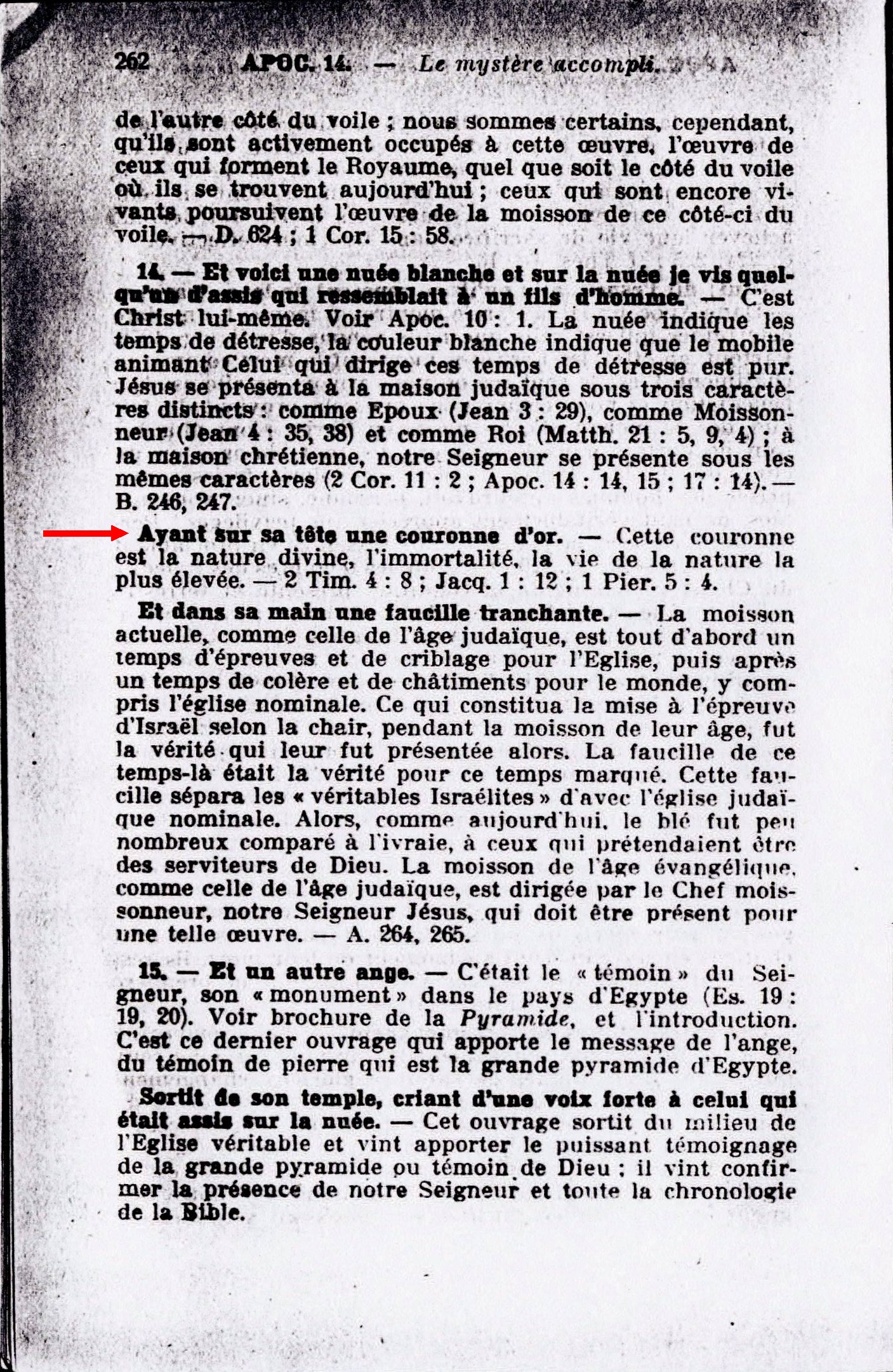 Ayant sur sa tête une couronne d'or. - Cette couronne est la nature divine, l'immortalité, la vie de la nature la plus élevée. - 2 Tim. 4:8; Jacq. 1:12; 1 Pier. 5:4. Source : 🇫🇷 1917 - Le Mystere Accompli, page 262 + Cover |