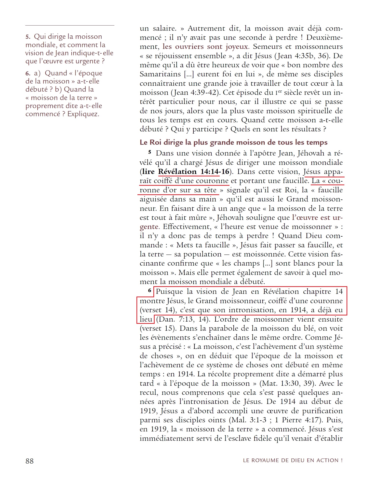 Dans une vision donnée à l’apôtre Jean, Jéhovah a révélé qu’il a chargé Jésus de diriger une moisson mondiale (lire Révélation 14:14-16). Dans cette vision, Jésus apparaît coiffé d’une couronne et portant une faucille. La « couronne d’or sur sa tête » signale qu’il est Roi [...] Puisque la vision de Jean en Révélation chapitre 14 montre Jésus, le Grand moissonneur, coiffé d’une couronne (verset 14), c’est que son intronisation, en 1914, a déjà eu lieu.