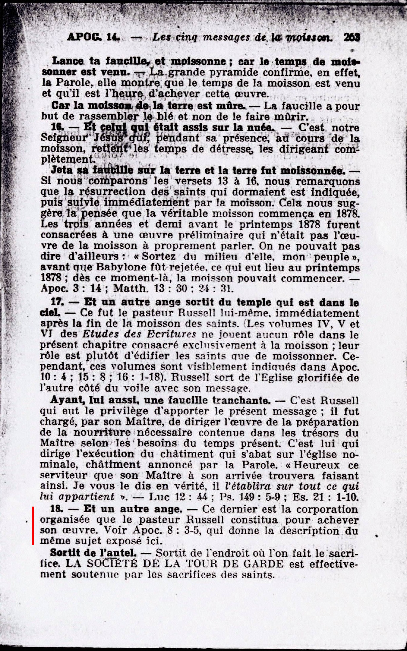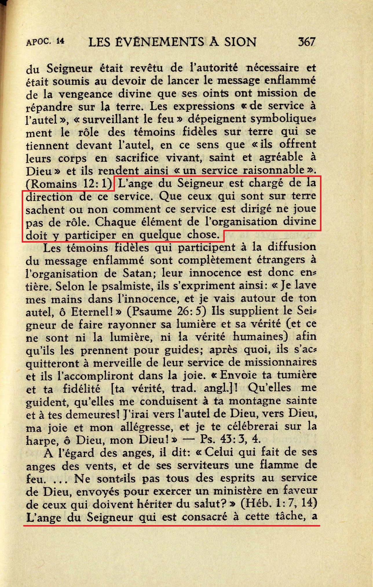 Jean ajoute: "Et un autre ange, qui avait autorité sur le feu, sortit de l'autel, et s'adressa d'une voix forte à celui qui avait la faucille tranchante, disant: Lance ta faucille tranchante, et vendange les grappes de la vigne de la terre; car les raisins de la terre sont mûrs." (Apoc. 14:18) Il est certain que cet ange du Seigneur était revêtu de l'autorité nécessaire et était soumis au devoir de lancer le message enflammé de la vengeance divine que ses oints ont mission de répandre sur la terre [...] L'ange du seigneur est chargé de la direction de ce service. Que ceux qui sont sur terre sachent ou non comment ce service est dirigé ne joue pas de rôle. Chaque élément de l'organisation divine doit y participer en quelque chose. [...] L'ange du Seigneur qui est consacré à cette tâche, a reçu pleins pouvoirs sur le feu, ce qui symbolise le message de destruction, et les membres du "reste", par le truchement de ce messager invisible, sont orientés dans la voie de leur mission.