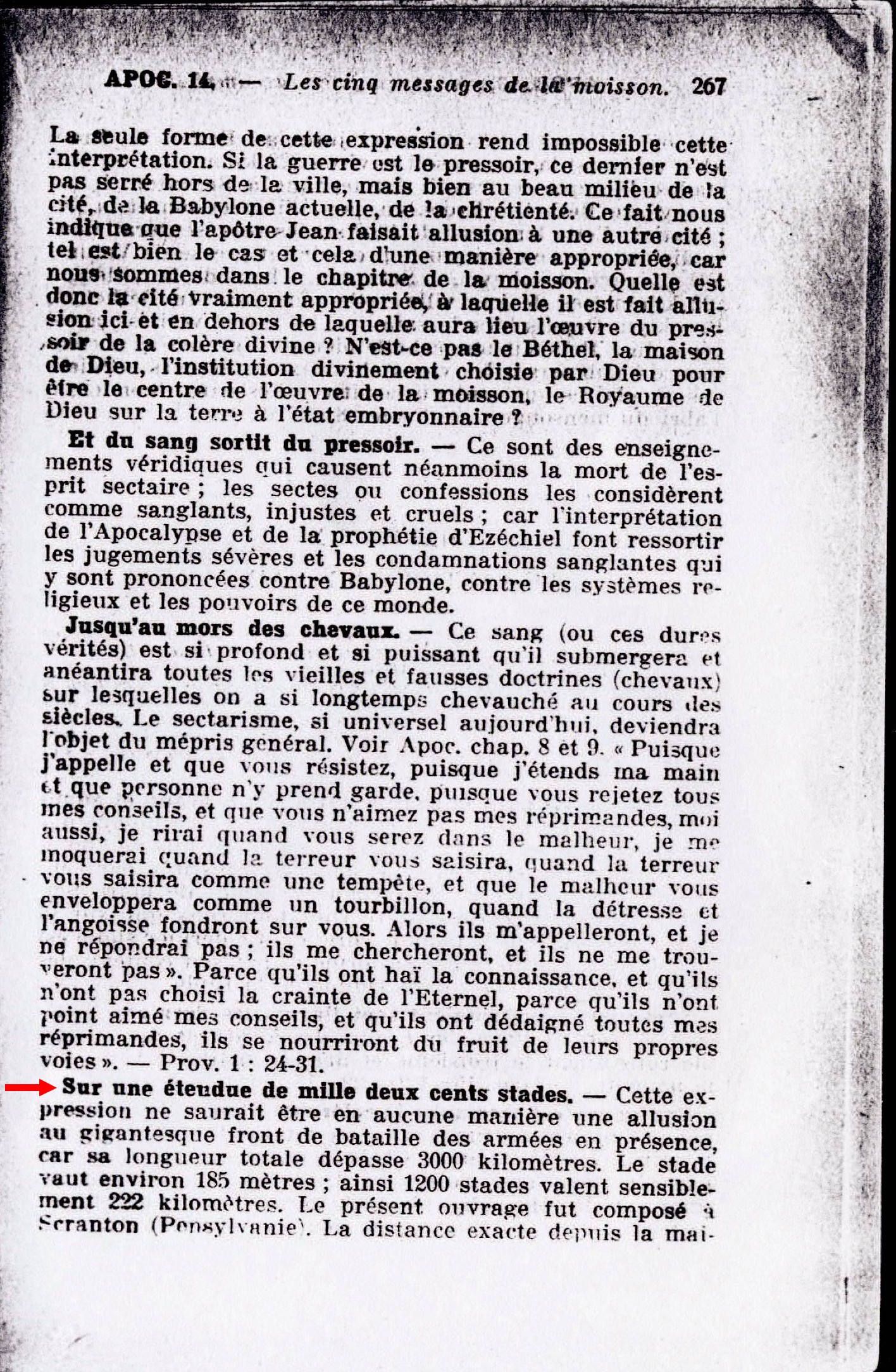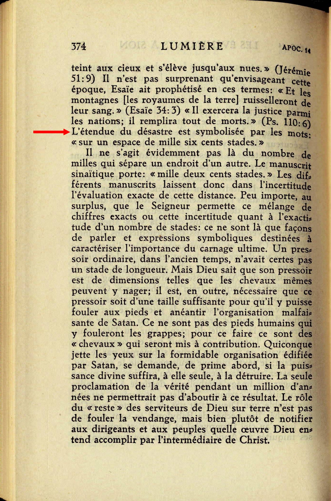 Sur une étendue de mille deux cents stades. - Cette expression ne saurait être en aucune manière une allusion au gigantesque front de bataille des armées en présence, car sa longueur totale dépasse 3000 kilomètres. Le stade vaut environ 185 mètres; ainsi 1200 stades valent sensiblement 222 kilomètres. Le présent ouvrage fut composé à Scranton (Pensylvanie). La distance exacte depuis la maison où ce travail fut accompli jusqu'au Béthel de Brooklyn est aussi la même, soit 222 kilomètres ou 1200 stades. Dès que le travail fut terminé à Scranton, il fut envoyé au Béthel, à Brooklyn, pour l'impression et la publication. Cette longueur de 1200 stades représenterait donc la distance de l'endroit où le pressoir fut pressé (le Volume VII préparé et achevé), à Scranton, "hors de la ville", à 222 kilomètres de la "ville" elle-même, ou du Béthel de Brooklyn. Source : 🇫🇷 1917 - Le Mystere Accompli, page 267, page 268 + Cover |