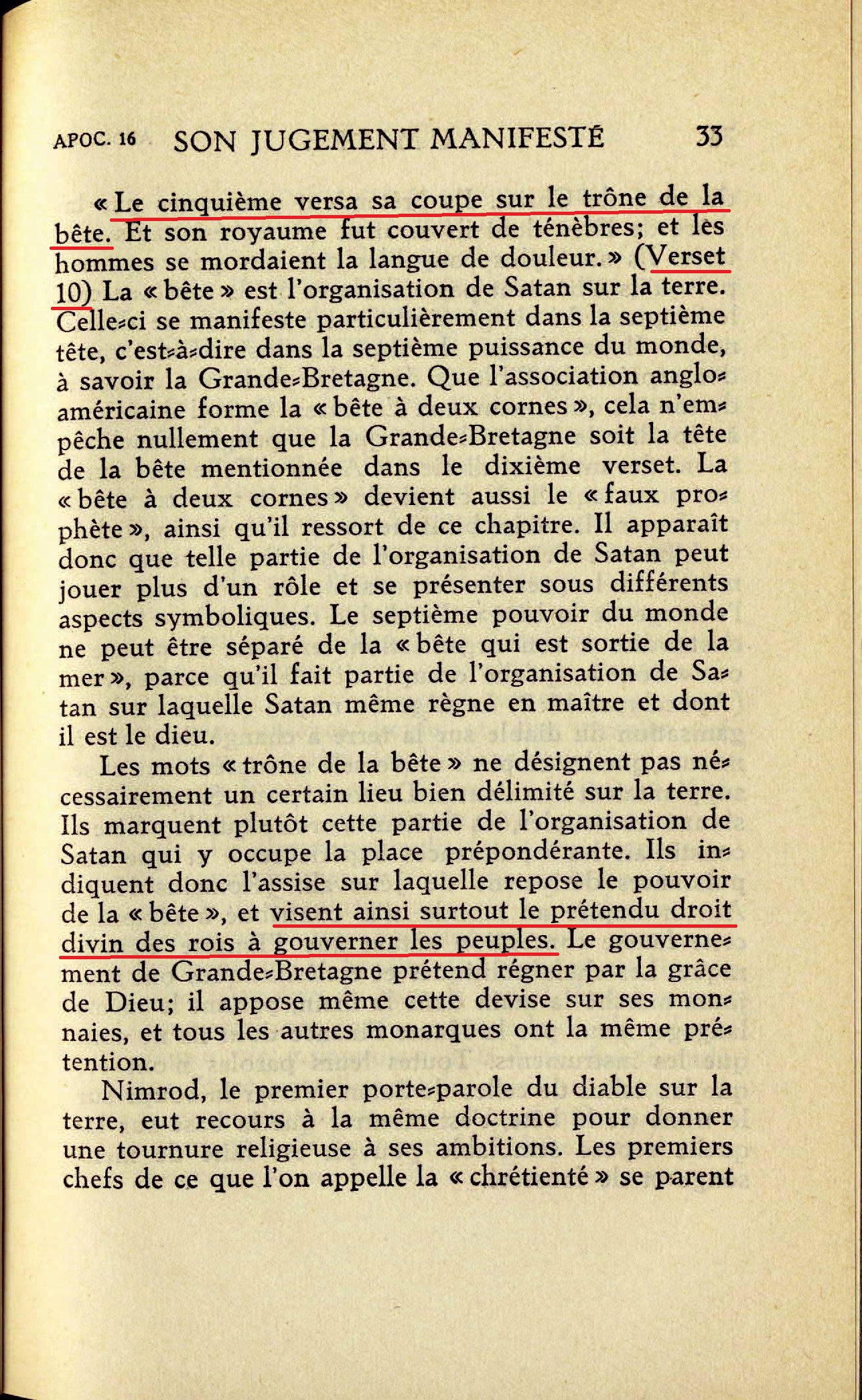 "Le cinquième versa sa coupe sur le trône de la bête. Et son royaume fut couvert de ténèbres; et les hommes se mordaient la langue de douleur." (Verset 10) [...] La "bête" est l'organisation de Satan sur la terre [...] Les mots "trône de la bête" ne désigne pas nécessairement un certain lieu bien délimité sur la terre. Ils marquent plutôt cette partie de l'organisation de Satan qui y occupe la place prépondérante. Ils indiquent donc l'assise sur laquelle repose le pouvoir de la "bête", et visent ainsi surtout le prétendu droit divin des rois à gouverner les peuples. [...] Le diable donna à la "bête", c'est-à-dire à son organisation terrestre, le "siège" ou "trône" qu'elle occupe dès le commencement [...] Le siège ou noyau central de l'organisation du diable sur la terre a changé de place à mesure que les empires universels se succédaient et se supplantaient l'un l'autre [...] Verser la coupe sur le trône de la bête, c'est montrer que la base sur laquelle repose semblable pouvoir est faite de mensonge et de fausseté. Source : 🇫🇷 1930 - Lumière, Vol 2, page 33, page 34 + Cover |