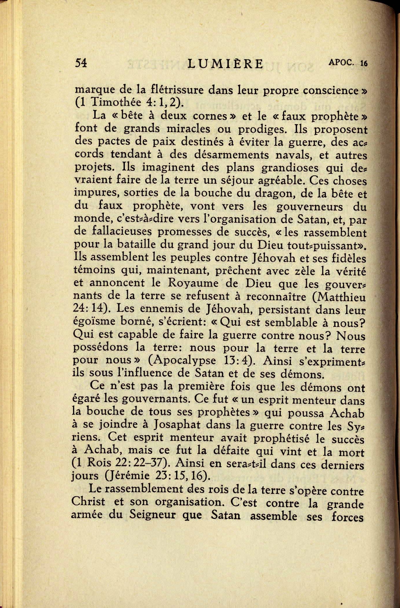 "Car ce sont des esprits de démons, qui font des prodiges, et qui vont vers les rois de toute la terre, afin de les rassembler pour le combat du grand jour du Dieu tout-puissant" (Verset 14). De même que les fidèles témoins de Dieu sur terre sur la terre proclament les jugements de Jéhovah, ainsi les représentants de Satan, et particulièrement le "faux prophète", répandent la doctrine des démons. Les deux nations qui constituent le "faux prophète" [Grande Bretagne + Amérique] se sont dit longtemps chrétiennes; mais, comme elles ont abandonné la parole de Dieu et son Royaume, elles ne sont que des hypocrites, des adeptes des doctrines du diable [...] La "bête à deux cornes" et le "faux prophète" font de grands miracles ou prodiges. Ils proposent des pactes de paix destinés à éviter la guerre, des accords tendant à des désarmements navals, et autres projets. Ils imaginent des plans grandioses qui devraient faire de la terre un séjour agréable. Ces choses impures, sorties de la bouche du dragon, de la bête et du faux prophète vont vers les gouverneurs du monde, c'est-à-dire vers l'organisation de Satan, et, par de fallacieuses promesses de succès, "les rassemblent pour la bataille du grand jour du Dieu tout-puissant". Source : 🇫🇷 1930 - Lumière, Vol 2, page 53, page 54 + Cover |