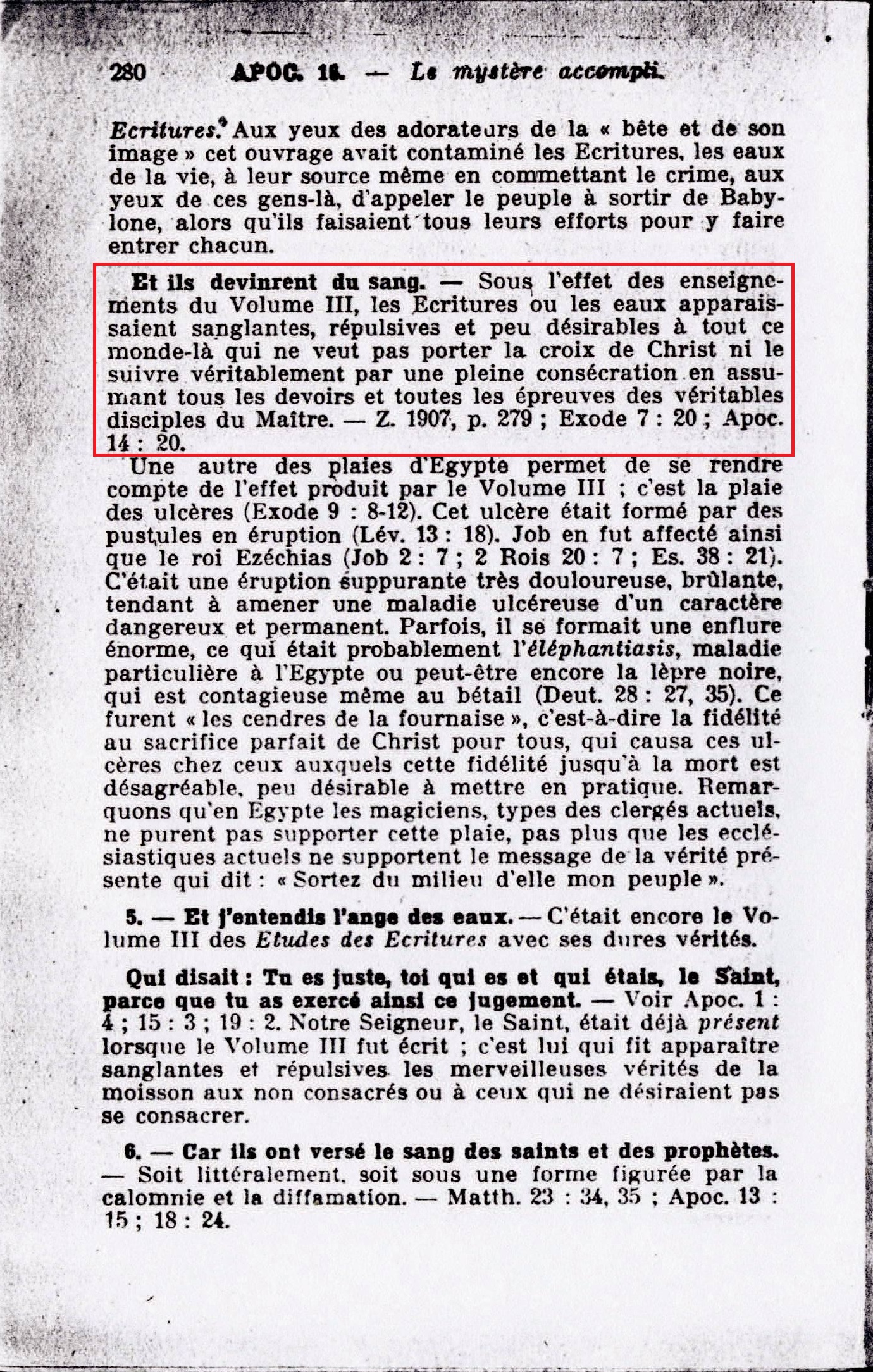 Et ils devinrent du sang. - Sous l'effet des enseignements du Volume III, les Ecritures ou les eaux apparaissaient sanglantes, répulsives et peu désirables à tout ce monde-là qui ne veut pas porter la croix de Christ ni le suivre véritablement par une pleine consécration en assumant tous les devoirs et toutes les épreuves des véritables disciples du Maître. - Z. 1907, p.279; Exode 7:20; Apoc. 14:20. Source : 🇫🇷 1917 - Le Mystere Accompli, page 280 + Cover |