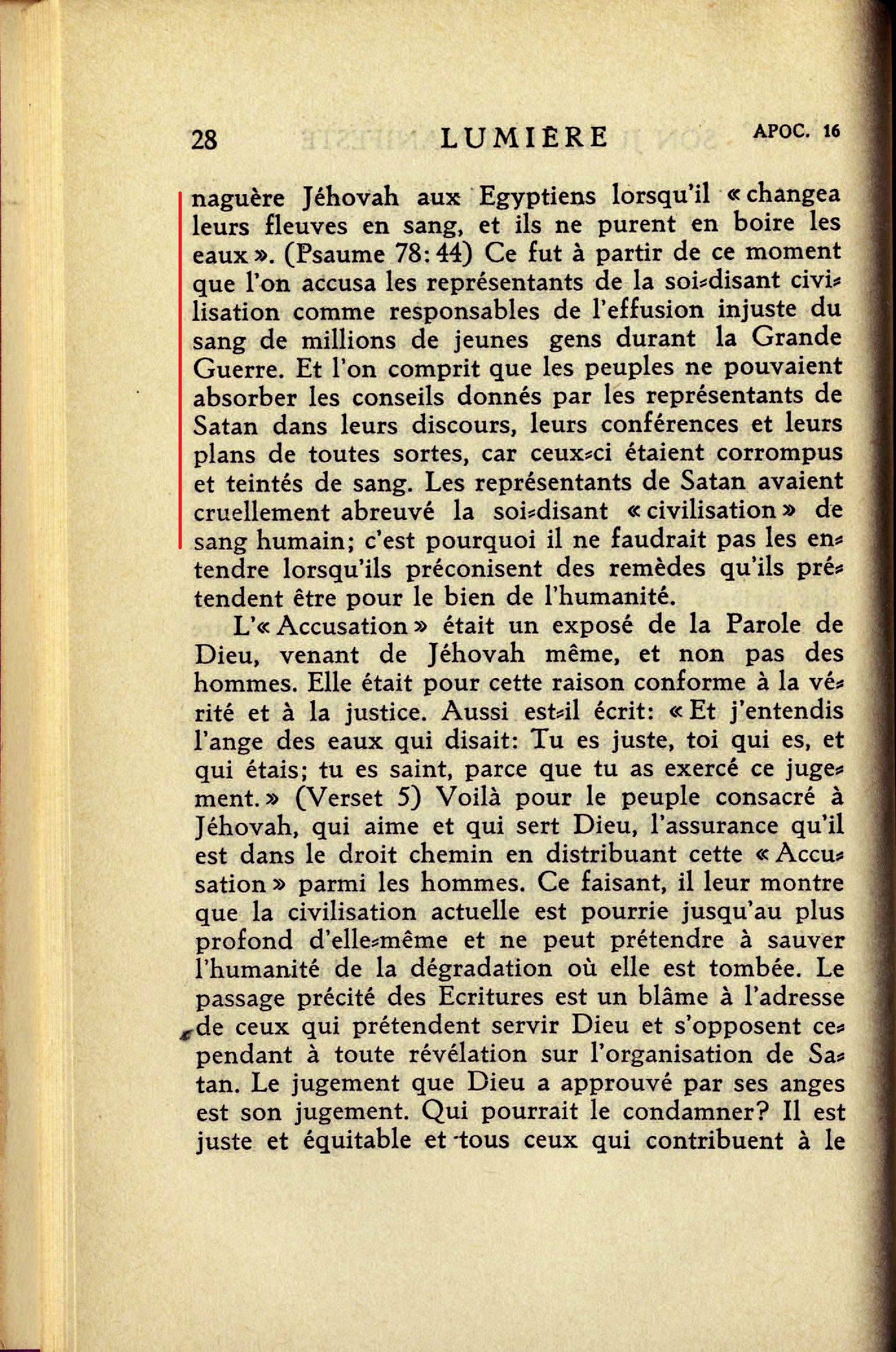 Lorsque la coupe fut versée dans les "fleuves et les sources d'eau", elles devinrent du "sang", c'est-à-dire la nourriture de la mort. C'est ce qu'avait fait naguère Jéhovah aux Egyptiens lorsqu'il "changea leurs fleuves en sang, et ils ne purent en boire les eaux". (Psaume 78:44) Ce fut à partir de ce moment que l'on accusa les représentants de la soi-disant civilisation comme responsables de l'effusion injuste du sang de millions de jeunes gens durant la Grande Guerre. Et l'on comprit que les peuples ne pouvaient absorber les conseil donnés par les représentants de Satan dans leurs discours, leurs conférences et leurs plans de toutes sortes, car ceux-ci étaient corrompus en teintés de sang. Les représentants de Satan avaient cruellement abreuvé la soi-disant "civilisation" de sang humain; c'est pourquoi il ne faudrait pas les entendre lorsqu'ils préconisent des remèdes qu'ils prétendent être pour le bien de l'humanité. Source : 🇫🇷 1930 - Lumière, Vol 2, page 27, page 28 + Cover |