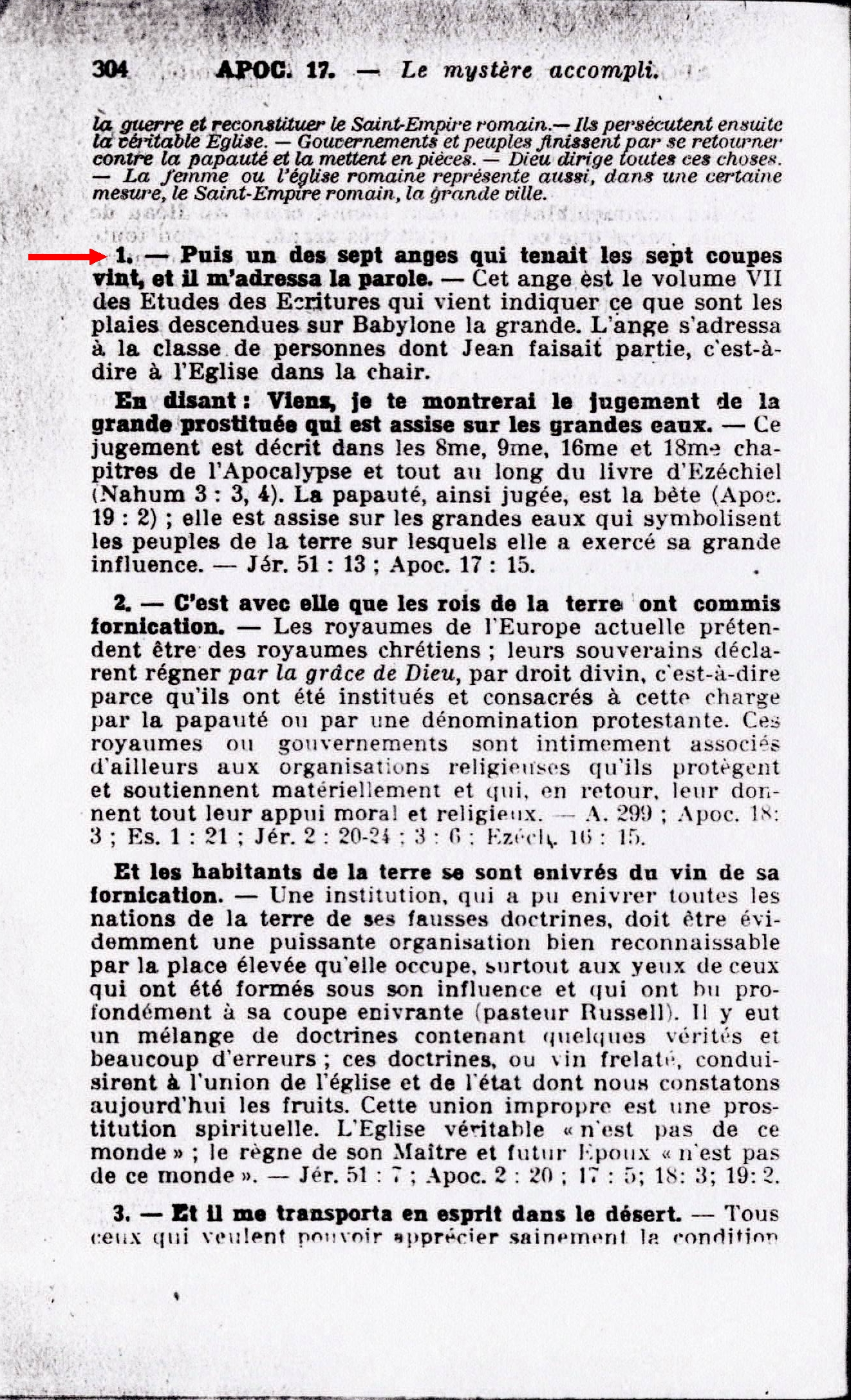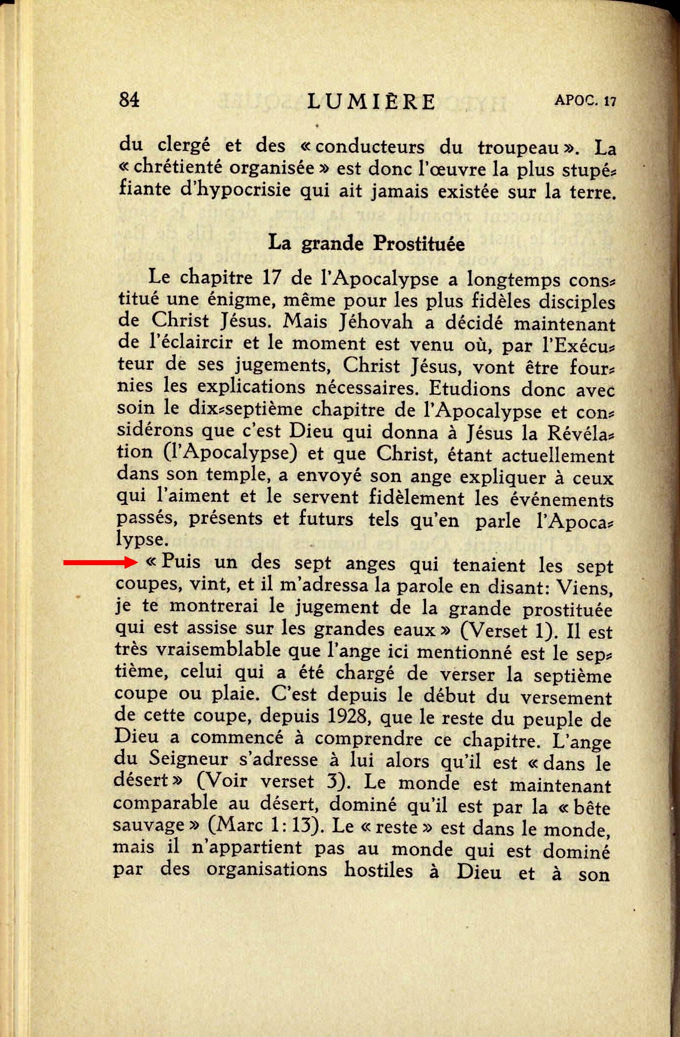 "Puis un des sept anges qui tenaient les sept coupes, vint et il m'adressa la parole en disant: Viens, je te montrerai le jugement de la grande prostituée qui est assise sur les grandes eaux" (Verset 1). Il est très vraisemblable que l'ange ici mentionné est le septième, celui qui a été chargé de verser la septième coupe ou plaie. C'est depuis le début du versement de cette coupe, depuis 1928, que le reste du peuple de Dieu a commencé à comprendre ce chapitre. Source : 🇫🇷 1930 - Lumière, Vol 2, page 84 + Cover |