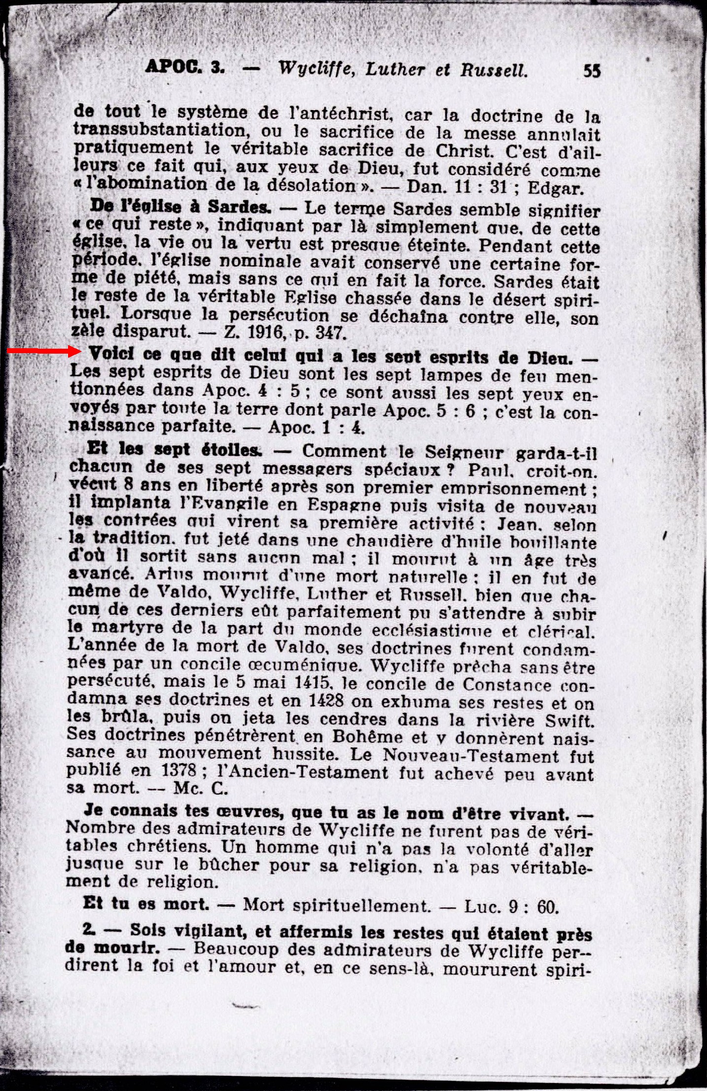 Voici ce que dit celui qui a les sept esprits de Dieu - Les septs esprits de Dieu sont les sept lampes de feu mentionnées dans Apoc. 4 : 5; ce sont aussi les sept yeux envoyés par toutes la terre dont parle Apoc 5 : 6 ; c'est la connaissance parfaite. - Apoc. 1 : 4. Source : 🇫🇷 1917 - Etudes des écritures, vol 7, le Mystère Accompli, page 55 + Cover |