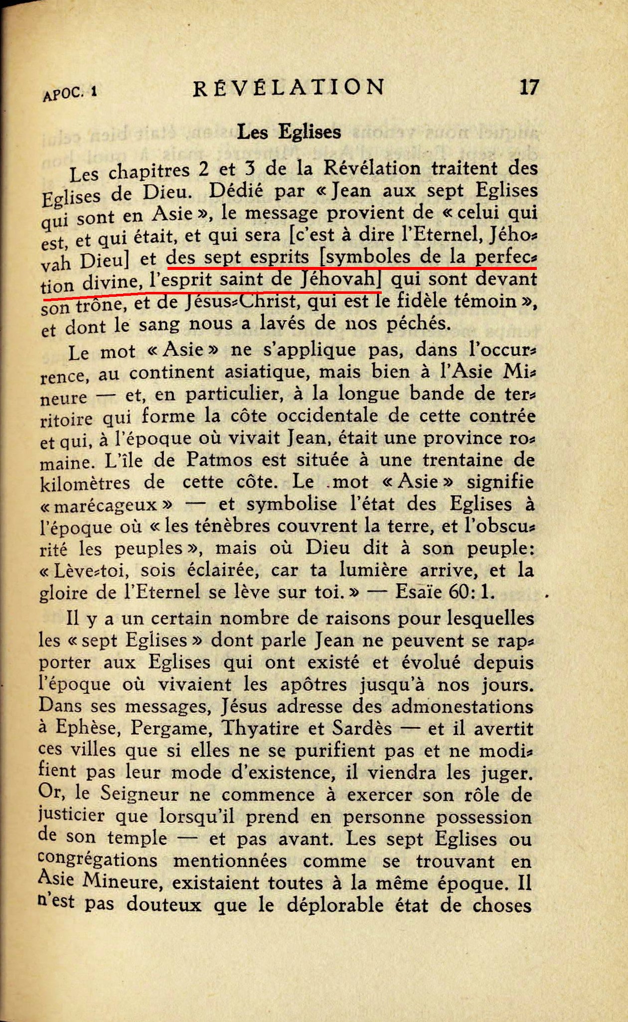 Les chapitres 2 et 3 de la Révélation traitent des Eglises de Dieu. Dédié par "Jean aux sept Eglises qui sont en Asie, le message provient de "celui qui est, et qui était, et qui sera [c'est à dire l'Eternel, Jéhovah Dieu] et des sept esprits [symboles de la perfection divine, l'esprit saint de Jéhovah] qui sont devant son trône, et de Jésus-Christ, qui est le fidèle témoin" [...] Source : 🇫🇷 Lumière, vol 1, page 17 + Cover |