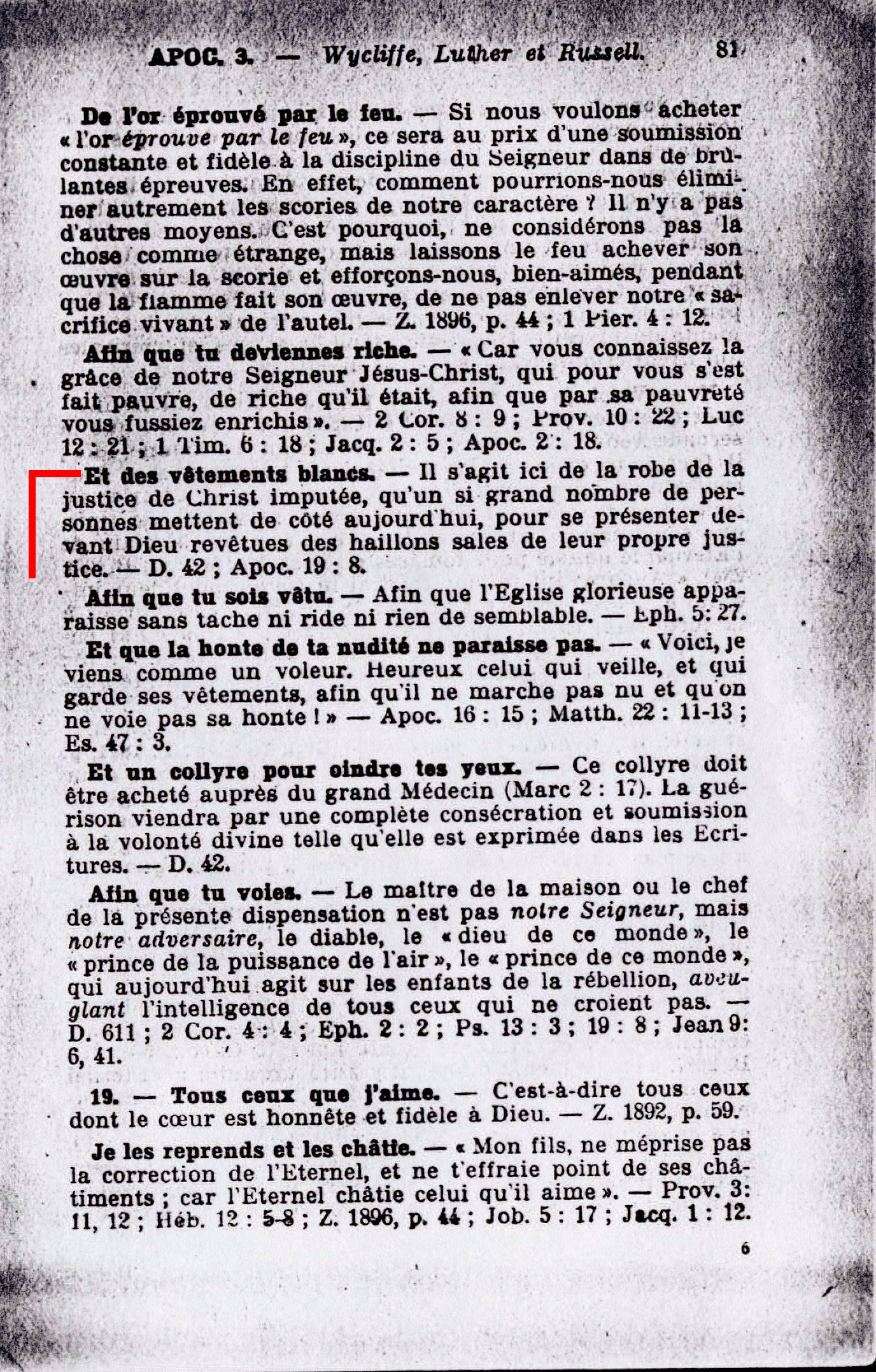 Et des vêtements blancs. - Il s'agit ici de la robe de la justice de Christ imputée, qu'un si grand nombre de personnes mettent de côté aujourd'hui, pour se présenter devant Dieu revêtue des haillons sales de leur propre justice. Source : 🇫🇷 1917 - Etudes des écritures, vol 7, le Mystère Accompli, page 81 + Cover |