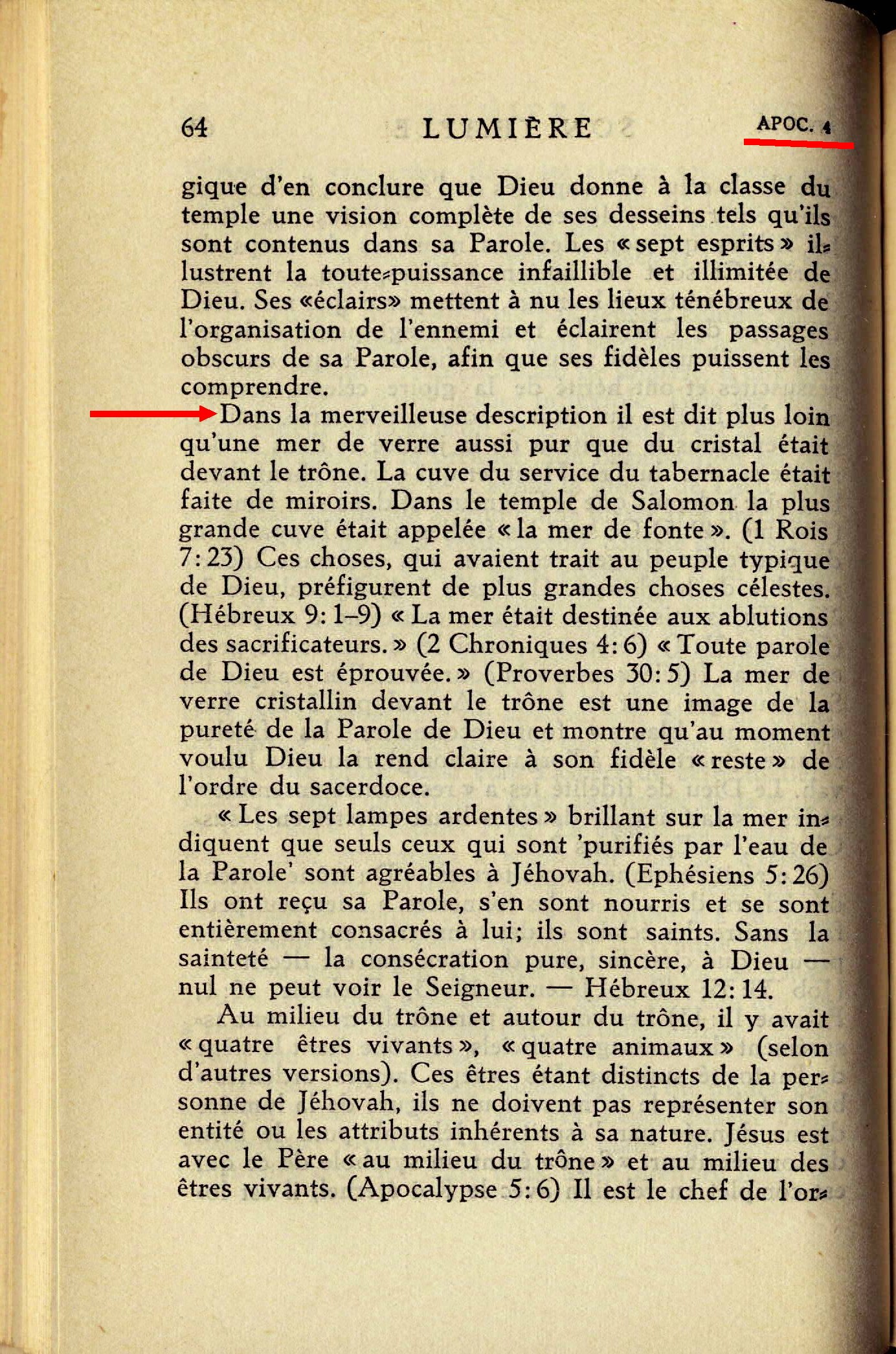 Dans la merveilleuse description il est dit plus loin qu'une mer de verre aussi pur que du cristal était devant le trône. La cuve du service du tabernacle était faite de miroirs. dans le temps de Salomon la plus grande cuve était appelé " la mer de fonte ". (1 rois 7:23) Ces choses, qui avaient trait au peuple typique de Dieu, préfigurent de plus grandes choses célestes... La mer de verre cristallin devant le trône est une image de la pureté de la Parole de Dieu et montre qu'au moment voulu Dieu la rend claire à son fidèle "reste" de l'ordre du sacerdoce. Source : 🇫🇷 1930 - Lumière, vol 1, page 64, Cover |