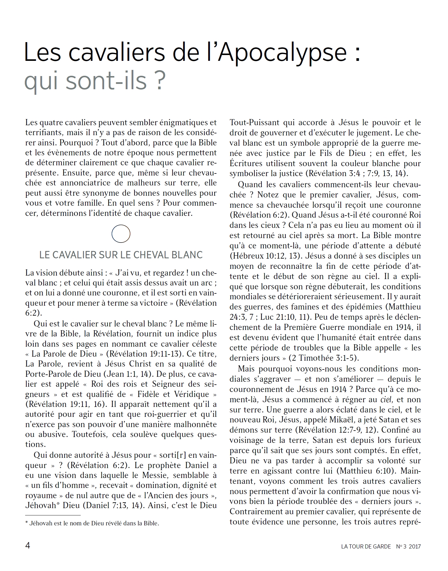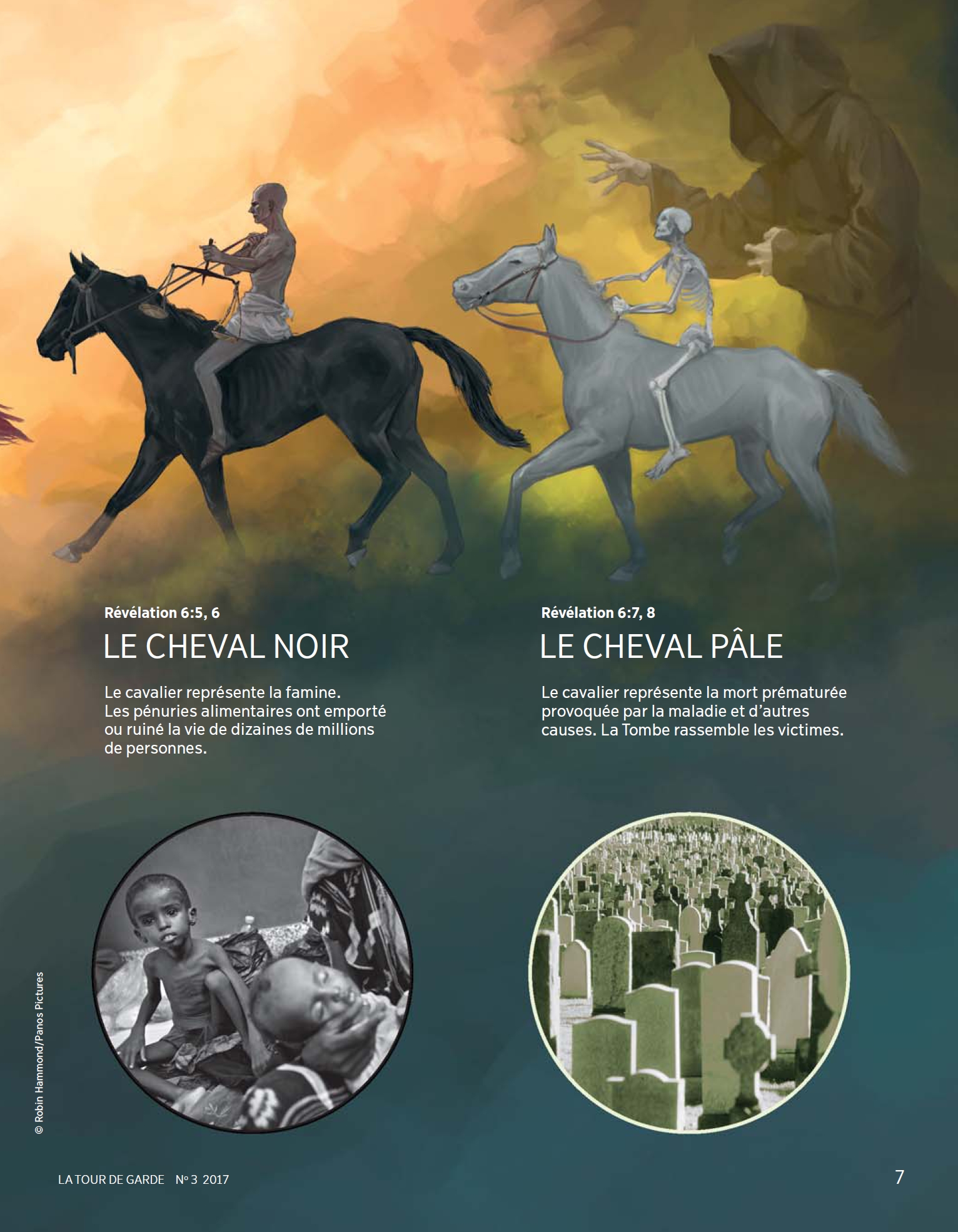 [1] LE CAVALIER SUR LE CHEVAL BLANC [...] Qui est le cavalier sur le cheval blanc ? Le même livre de la Bible, la Révélation, fournit un indice plus loin dans ses pages en nommant ce cavalier céleste «La Parole de Dieu» (Révélation 19:11-13). Ce titre, La Parole, revient à Jésus Christ en sa qualité de Porte-Parole de Dieu (Jean 1:1, 14). [...] [2] LE CAVALIER SUR LE CHEVAL ROUGE [...] Ce cavalier représente la guerre. Remarquez qu’il ôte la paix de la terre entière, et pas uniquement de quelques nations. En 1914, et pour la première fois de l’Histoire, une guerre mondiale a éclaté. Elle a été suivie d’une deuxième guerre mondiale, encore plus destructrice. [...] [3] LE CAVALIER SUR LE CHEVAL NOIR [...] Ce cavalier représente la famine. Ces versets décrivent de façon figurée un rationnement alimentaire si strict qu’un litre de blé coûterait un denier, soit, au Ier siècle, le salaire de toute une journée de travail ! [...] Au cours du XXe siècle, la famine a tué environ 70 millions de personnes. Selon une agence des Nations unies, « 805 millions de personnes — soit environ un neuvième de la population mondiale — étaient en situation de sous-alimentation chronique en 2012-14. » [4] LE CAVALIER SUR LE CHEVAL PÂLE Le quatrième cavalier représente la mort provoquée par des épidémies et d’autres causes. Peu après 1914, la grippe espagnole a fait des dizaines de millions de morts. Cinq cents millions de personnes auraient été infectées, soit à l’époque un humain sur trois. Source : 🇫🇷 La Tour de Garde, n°3, 2017, page 4, page 5, page 6, page 7 + Cover - (ou en ligne) |