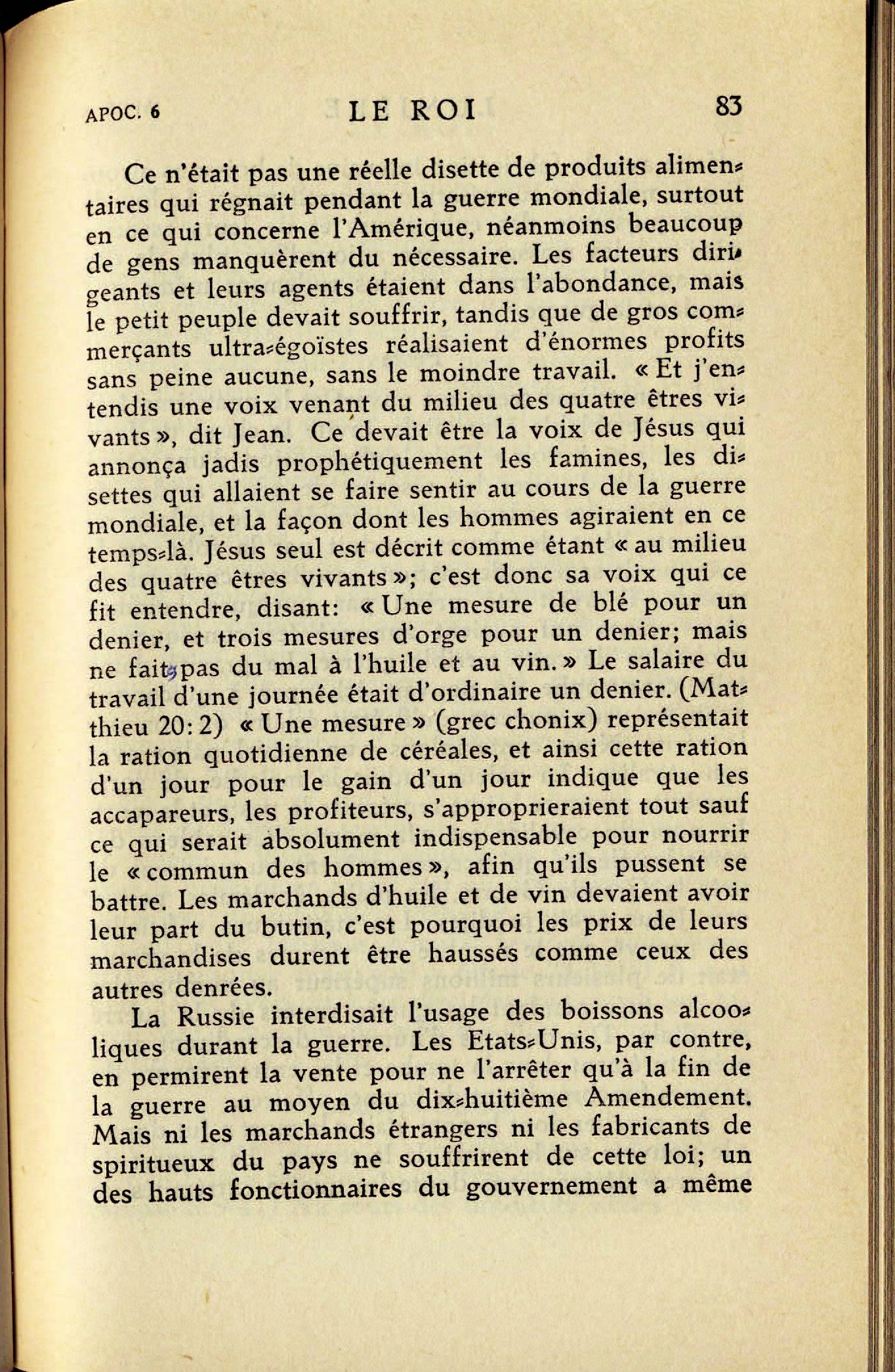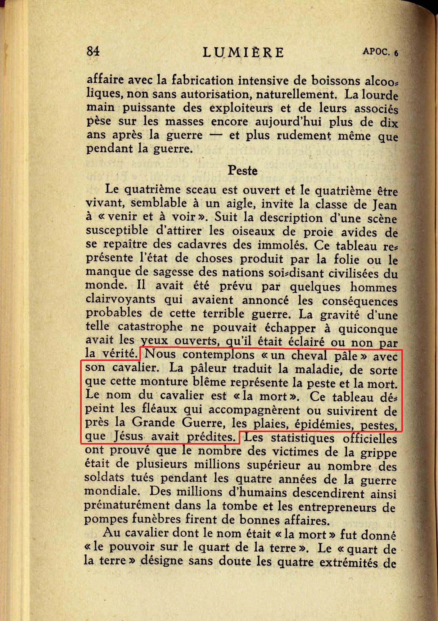 [2] Le cheval roux apparaît; à son cavalier fut donné "le pouvoir d'enlever la paix de la terre afin que les hommes s'égorgeassent les uns les autres". Ce sont en particulier les éléments financier, militaire, politique et ecclésiastiques de l'organisation de Satan qui se liguent ensemble pour enlever la paix de la terre, ce qu'ils ont du reste fait. Cela se passa de 1914 à 1918 [...] [3] Comme il regardait, explique Jean, il vit un cheval noir dont le cavalier portait une balance. C'est là une représentation appropriée des accapareurs, des profiteurs, du gros négoce de l'organisation du diable avec leurs fausses balances et faux poids, qui fixèrent les prix des denrées alimentaires à leur gré avec l'assentiment des hommes politiques et du clergé de la prétendue chrétienté. [...] le petit peuple devait souffrir, tandis que de gros commerçants ultra-égoïstes réalisaient d'énormes profits [...] Ce devait être la voix de Jésus qui annonça jadis prophétiquement les famines, les disettes qui allaient se faire sentir au cours de la guerre mondiale, et la façon dont les hommes agiraient en ce temps-là. [...] "Une mesure" (grec chonix) représentait la ration quotidienne de céréales, et ainsi cette ration d'un jour pour le gain d'un jour indique que les accapareurs, les profiteurs, s'approprieraient tout sauf ce qui serait indispensable pour nourrir le "commun des hommes", afin qu'ils pussent se battre. Les marchands d'huile et de vin devaient avoir leur part du butin [...] La Russie interdisait l'usage des boissons alcooliques durant la guerre. [...] [4] Nous contemplons "un cheval pâle" avec son cavalier. La pâleur traduit la maladie, de sorte que cette monture blême représente la peste et la mort. Le nom du cavalier est "la mort". Ce tableau dépeint les fléaux qui accompagnèrent ou suivirent de près la Grande Guerre, les plaies, épidémies, pestes, que Jésus avait prédites. Les statistiques officielles ont prouvé que le nombre des victimes de la grippe était de plusieurs millions supérieur au nombre des soldats tués pendant les quatres années de la guerre mondiale. Des millions d'humains descendirent ainsi prématurément dans la tombe et les entrepreneurs de pompes funèbres firent de bonnes affaires. Au cavalier dont le nom était "la mort" fut donné "le pouvoir sur le quart de la terre". Source : 🇫🇷 1930 - Lumière, vol 1, page 78, page 79, page 80, page 81, page 83, page 84 + Cover |
