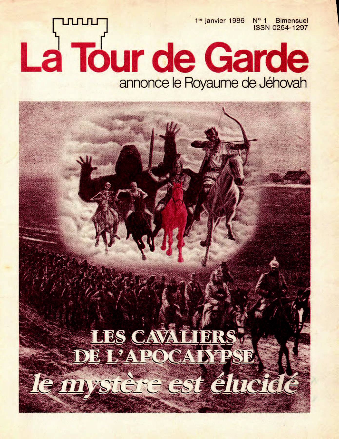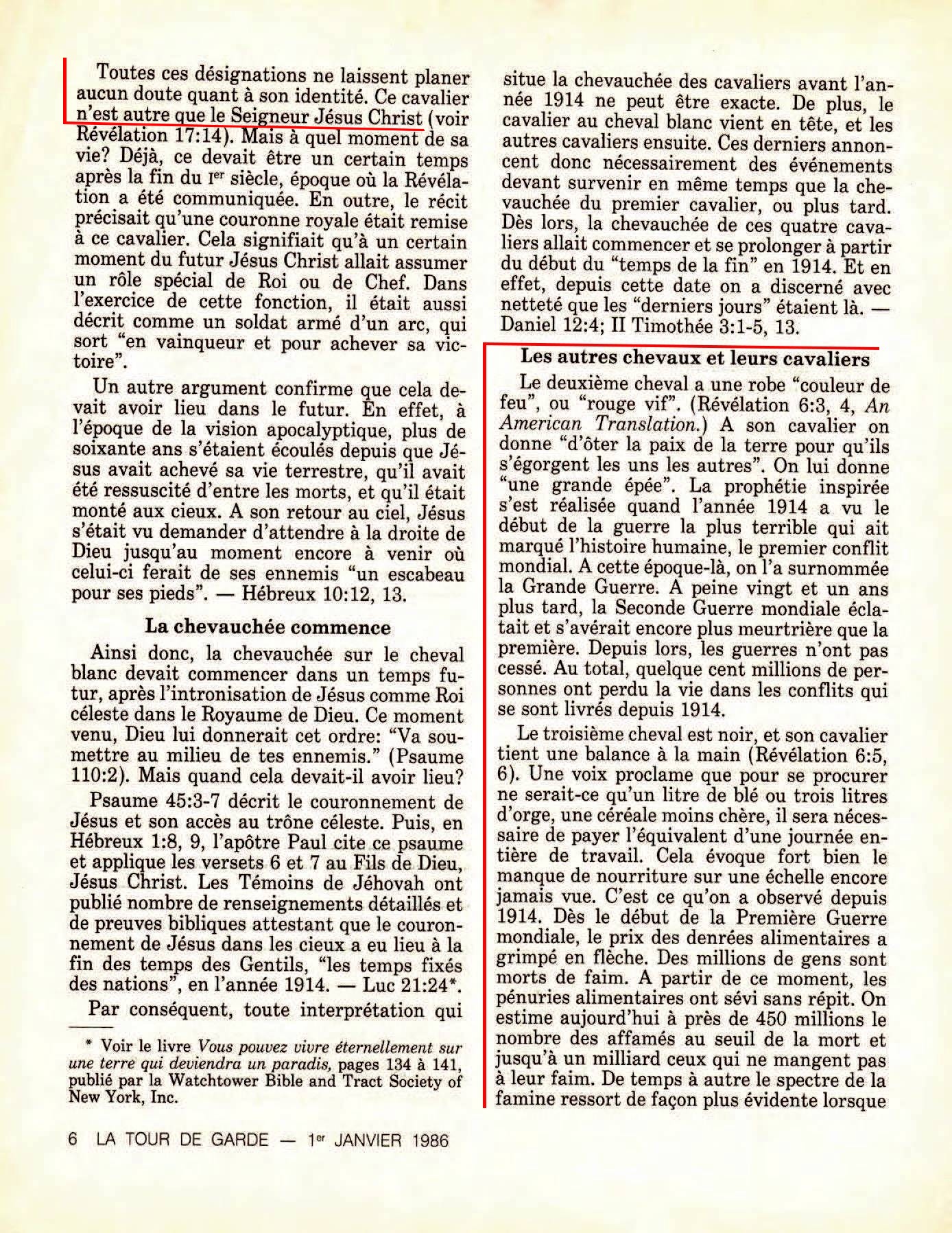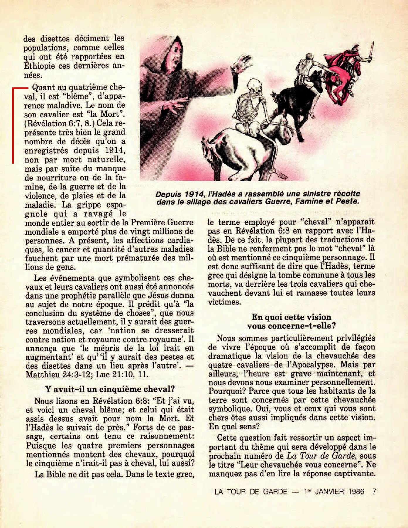 [2] Le deuxième cheval a une robe "couleur de feu", ou rouge vif" (Révélation 6:3, 4) A son cavalier on donne "d'oter la paix de la terre pour qu'ils s'égorgent les uns les autres". On lui donne "une grande épée". La prophétie inspiré s'est réalisé quand l'année 1914 a vu le début de la guerre [...] vingt et un ans plus tard, la Seconde Guerre mondiale éclatait [...] Depuis lors, les guerres n'ont pas cessé... [3] Le troisième cheval est noir, et son cavalier tient une balance à la main (Révélation 6:5, 6)... Cela évoque fort bien le manque de nourriture sur une échelle encore jamais vue. C'est ce qu'on a observé depuis 1914... des millions de gens sont morts de faim... [4] Quant au quatrième cheval, il est "blême", d'apparence maladive. Le nom de son cavalier est la "Mort" (Révélation 6:7,8). Cela représente très bien le grand nombre de décès qu'on a enregistrés depuis 1914, non par mort naturelle, mais par suite du manque de nourriture ou de la famine, de la guerre et de la violence, de plaies et de la maladie. Source : 🇫🇷 La Tour de Garde, 1 Janvier 1986, page 5, page 6, page 7 + Cover |