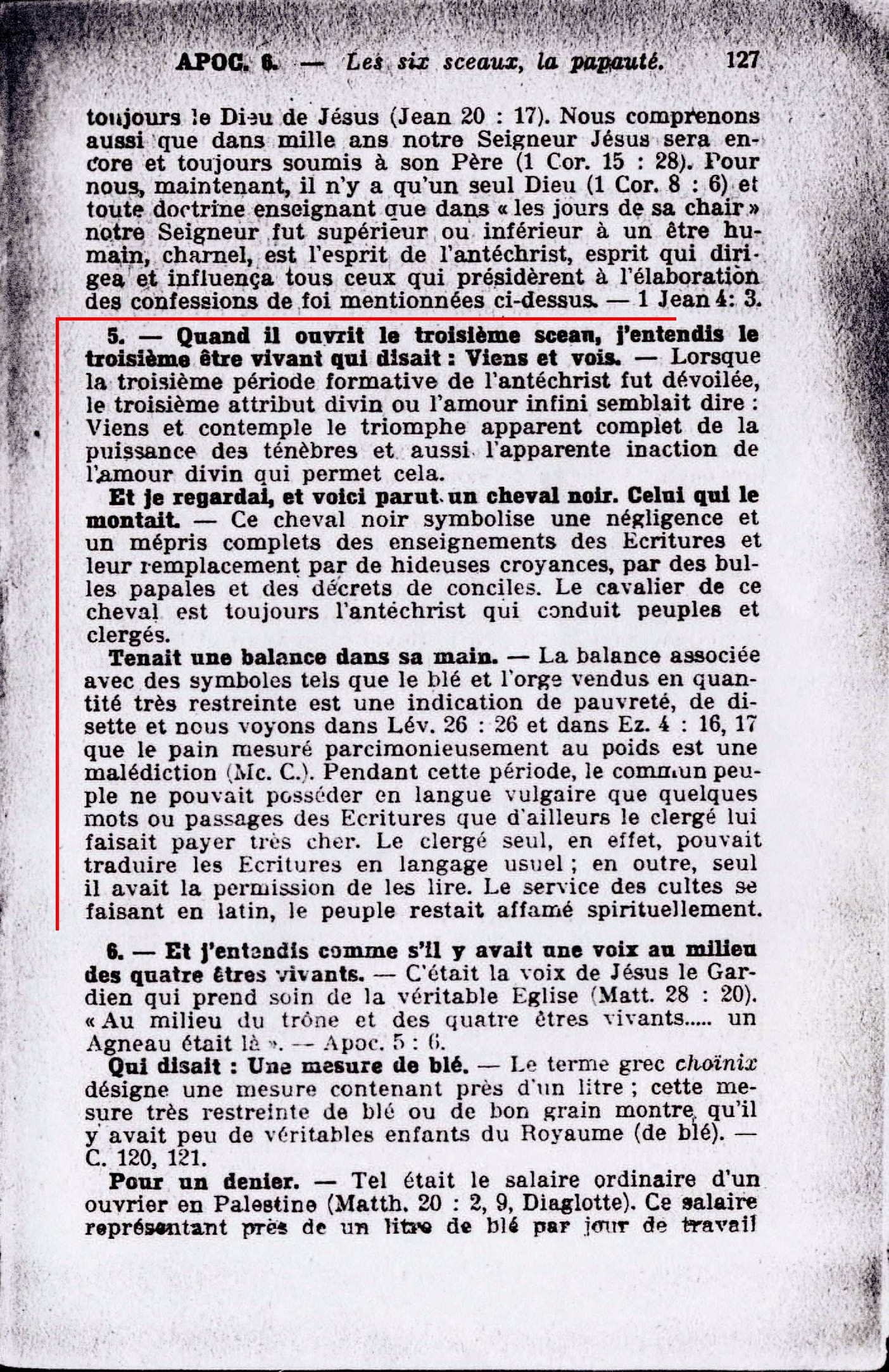 [2] Et il sortit un autre cheval qui était roux. - Ce cheval ou ces fausses doctrines différaient beaucoup des l'Ecritures qui furent singulièrement altérées déjà alors. Le roux est la couleur du péché, de l'imperfection, il est voisin du rouge. "Si vos péchés sont comme le cramoisi". - Es. 1:18... Et à celui qui était monté dessus, il fut donné la puissance d'enlever la paix de la terre. - Le cavalier était encore le même, c'était l'antéchrist, la papauté; elle obtint le pouvoir de confondre et d'embrouiller doctrinalement ceux qui avaient des principes religieux, c'est-à-dire tous ceux qui prétendaient former l'église de Dieu... Et une grande épée lui fut donnée. - Le seigneur à une grande et puissante épée qui est l'épée de l'esprit, la Parole de Dieu... [3] et voici parut un cheval noir. Celui qui le montait. - Ce cheval noir symbolise une négligence et un mépris complets des enseignements des Ecritures et leur remplacement par des hideuses croyances, par des bulles papales et des décrets de conciles. Le cavalier de ce cheval est toujours l'antéchrist qui conduit peuples et clergés... [4] Je regardais et voici, parut un cheval d'une couleur pâle. Celui qui le montait se nommait la mort. - Le cheval pâle ou livide était l'effroyable théorie papale qui demandait l'extermination des véritables enfants de Dieu... Le cavalier était encore le même, c'était la papauté... Source : 🇫🇷 1917 - Le Mystère Accompli, page 121, page 122, page 127, page 129 + Cover |