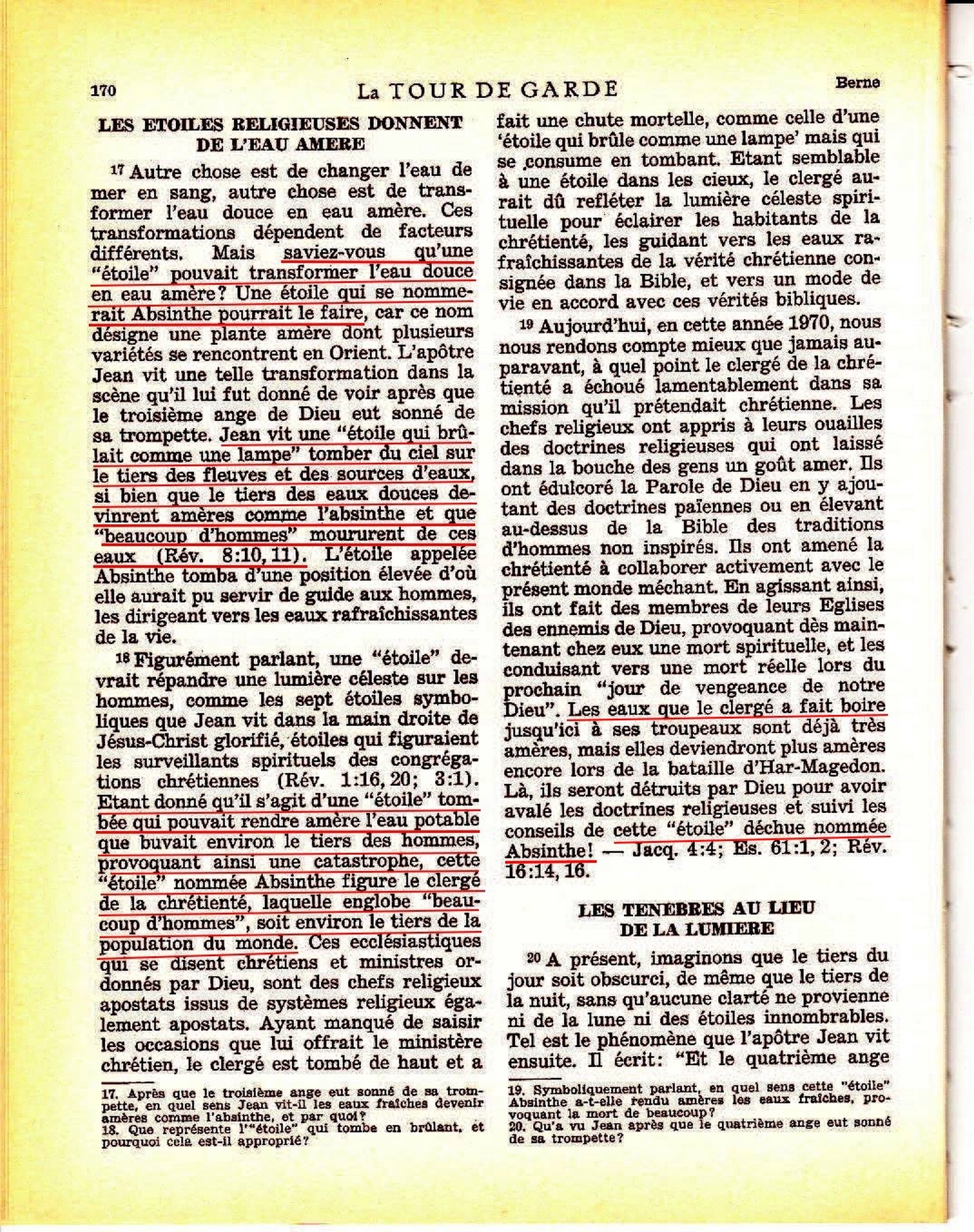 ”saviez-vous qu'une "étoile" pouvait transformer l'eau douce en eau amère? Une étoile qui se nommerait Absinthe pourrait le faire [...] Jean vit une "étoile qui brûlait comme une lampe" tomber du ciel sur le tiers des fleuves et des sources d'eaux, si bien que le tiers des eaux douces devinrent amères comme l'absinthe et que "beaucoup d'hommes" moururent de ces eaux (Rév. 8:10-11) [...] Etant donné qu'il s'agit d'une "étoile" tombée qui pouvait rendre amère l'eau potable que buvait environ le tiers des hommes, provoquant ainsi une catastrophe, cette "étoile" nommé Absinthe figure le clergé de la chrétienté, laquelle englobe "beaucoup d'hommes", soit environ le tiers de la population du monde.” [...] Les eaux que le clergé a fait boire jusqu'ici à ses troupeaux sont déjà très amères, mais elle deviendront plus amères encores lors de la bataille d'Har-Magedon. Là, seront détruits par Dieu pour avoir avalé les doctrines religieuses et suivi les conseils de cette "étoile" déchues nommée Absinthe ! Source : 🇫🇷 La Tour de Garde, 15 Mars 1970, page 170 + Cover |