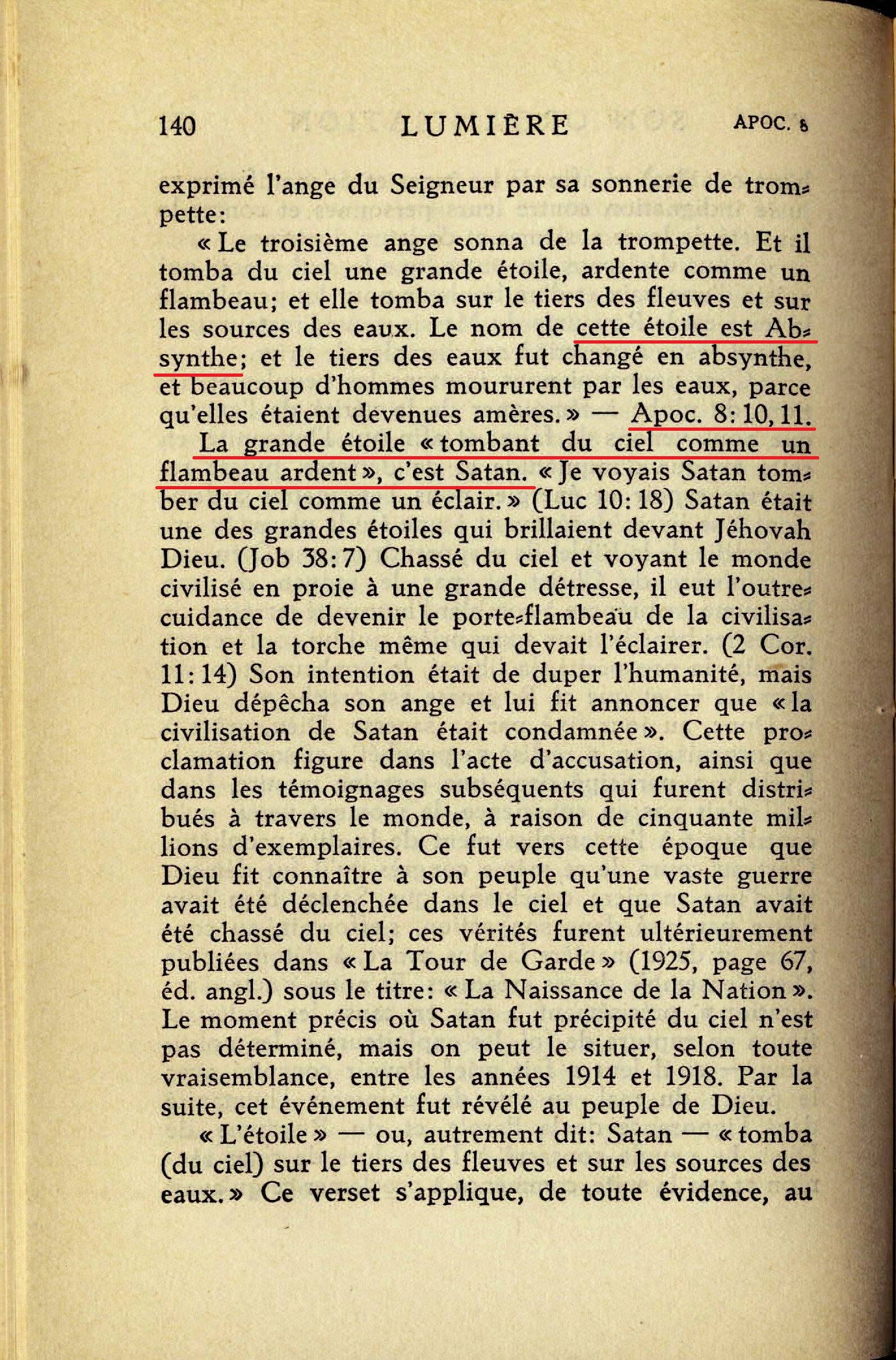 La grande étoile "tombant du ciel comme un flambeau ardent", c'est Satan. "Je voyais Satan tomber du ciel comme un éclair." (Luc 10:18) Satan était une des grandes étoiles qui brillaient devant Jéhovah Dieu. Source : 🇫🇷 1930 - Lumière, vol 1, page 140, Cover |