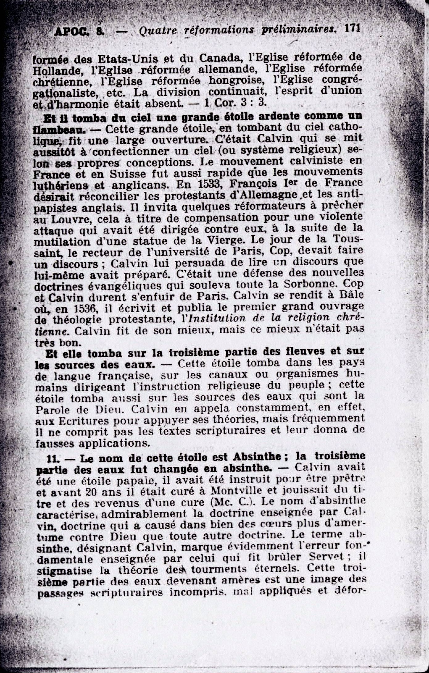 10. - Le troisième ange sonna de la trompette. - Ce fut le mouvement calviniste qui produisit un grand nombre de sectes dont voici les principales : l'Eglise presbytérienne du nord, l'Eglise calviniste du Pays de Galle, l'Eglise presbytérienne unie, l'Eglise presbytérienne associée, l'Eglise presbytérienne réformée, l'Eglise presbytérienne réformée des Etats-Unis et du Canada, l'Eglise réformée de Holande, l'Eglise réformée allemande, l'Eglise réformée chrétienne, l'Eglise réformée hongroise, l'Eglise congrégationaliste, etc. La division continuait, l'esprit d'union et d'harmonie était absent. - 1 Cor. 3:3. Source : 🇫🇷 1917 - Le Mystère Accompli, page 170, page 171 + Cover |