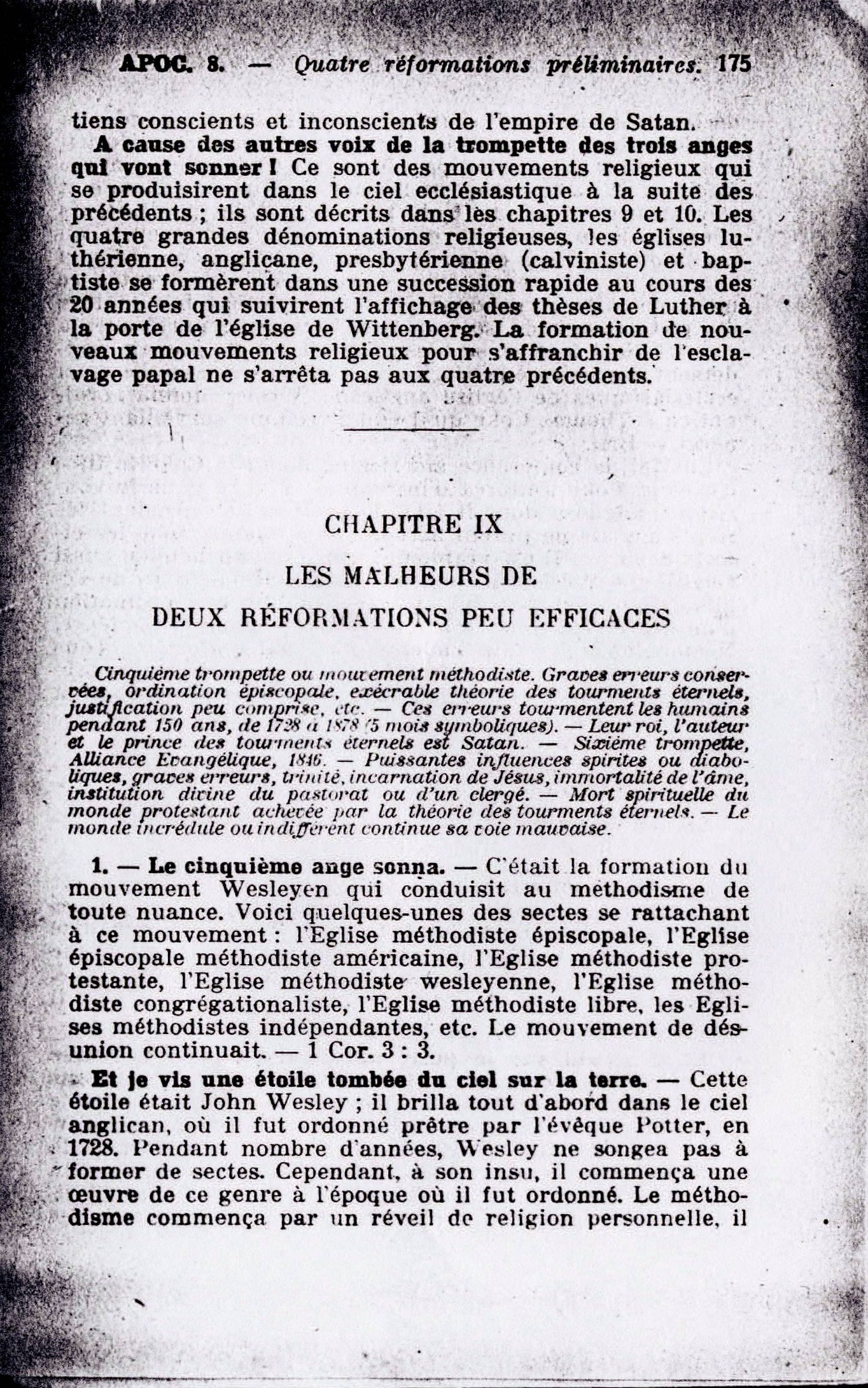 A cause des autres voix de la trompette des trois anges qui vont sonner ! Ce sont des mouvements religieux qui se produisirent dans le ciel ecclésiastique à la suite des précédents ; ils sont décrits dans les chapitres 9 et 10. Les quatre grande dénominations religieuses, les églises luthérienne, anglicane, presbytérienne (calviniste) et baptiste se formèrent dans une succession rapide au cours des 20 années qui suivirent l'affichage des thèses de Luther à la porte de l'église de Wittenberg. La formation de nouveaux mouvements religieux pour s'affranchir de l'esclavage papal ne s'arrêta pas aux quatre précédents. Source : 🇫🇷 1917 - Le Mystère Accompli, page 175 + Cover |