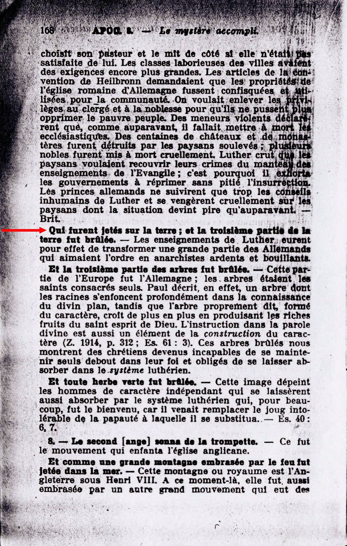 [...] et la troisième partie de la terre fut brûlée - Les enseignements de Luther eurent pour effet de transformer une grande partie des Allemands qui aimaient l'ordre en anarchistes ardents et bouillants. Source : 🇫🇷 1917 - Le Mystère Accompli, page 168 + Cover |