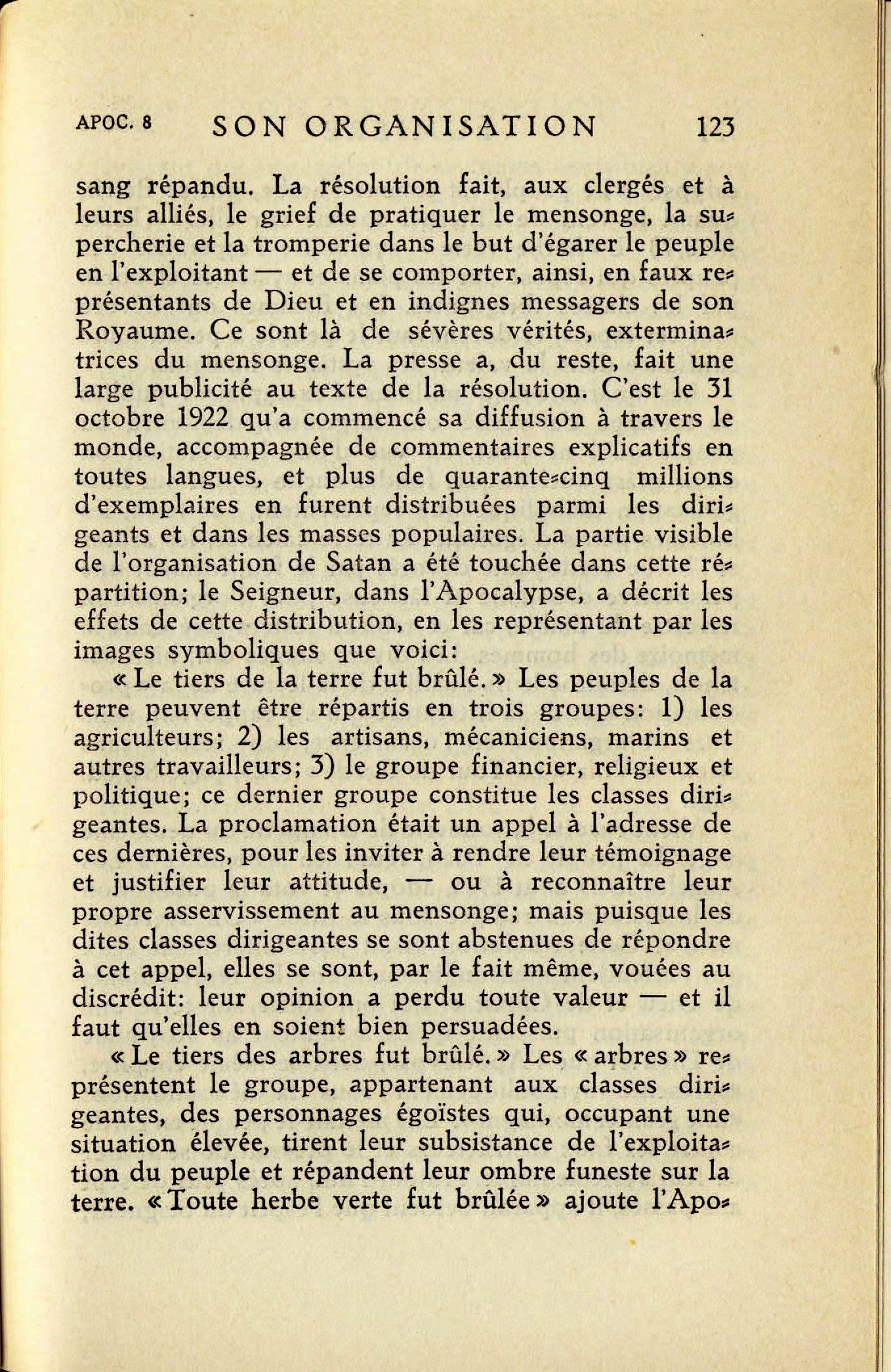 Et la troisième partie des arbres fut brûlée; - cette partie de l'Europe fut l'Allemagne ; les arbres étaient les saints consacrés seuls. Paul décrit, en effet, un arbre dont les racines s'enfoncent profondément dans la connaissance du divin plan, tandis que l'arbre proprement dit, formé du caractère, croît de plus en plus en produisant les riches fruits du saint-esprit de Dieu. L'instruction dans la parole divine est aussi un élément de la construction du caractère [...] Ces arbres brûlés nous montrent des chrétiens devenus incapables de se maintenir seuls debout dans leur foi et obligés de se laisser absorber dans le système luthérien. Source : 🇫🇷 1917 - Le Mystère Accompli, page 168 + Cover |
