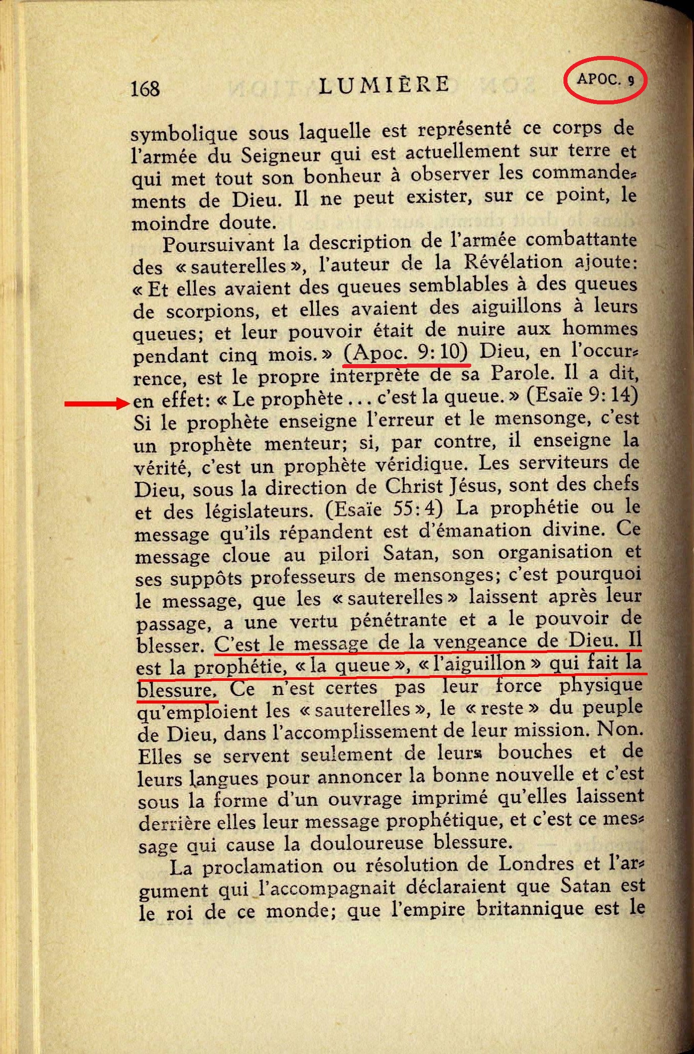 ... "Le prophète... c'est la queue." (Esaïe 9:14) Si le prophète enseigne l'erreur et le mensonge, c'est un prophète menteur; si, par contre, il enseigne la vérité, c'est un prophète véridique. Les serviteurs de Dieu, sous la direction de Christ Jésus, sont des chefs et des législateurs. (Esaïe 55:4) La prophétie ou le message cloue au pilori Satan, son organisation et ses suppôts professeurs de mensonges; c'est pourquoi le message, que les "sauterelles" laissent après leur passage, a une vertu pénétrante et a le pouvoir de blesser. C'est le message de la vengeance de Dieu. Il est la prophétie, "la queue", "l'aiguillon" qui fait la blessure. Source : 🇫🇷 1930 - Lumière, vol 1, page 168 + Cover |