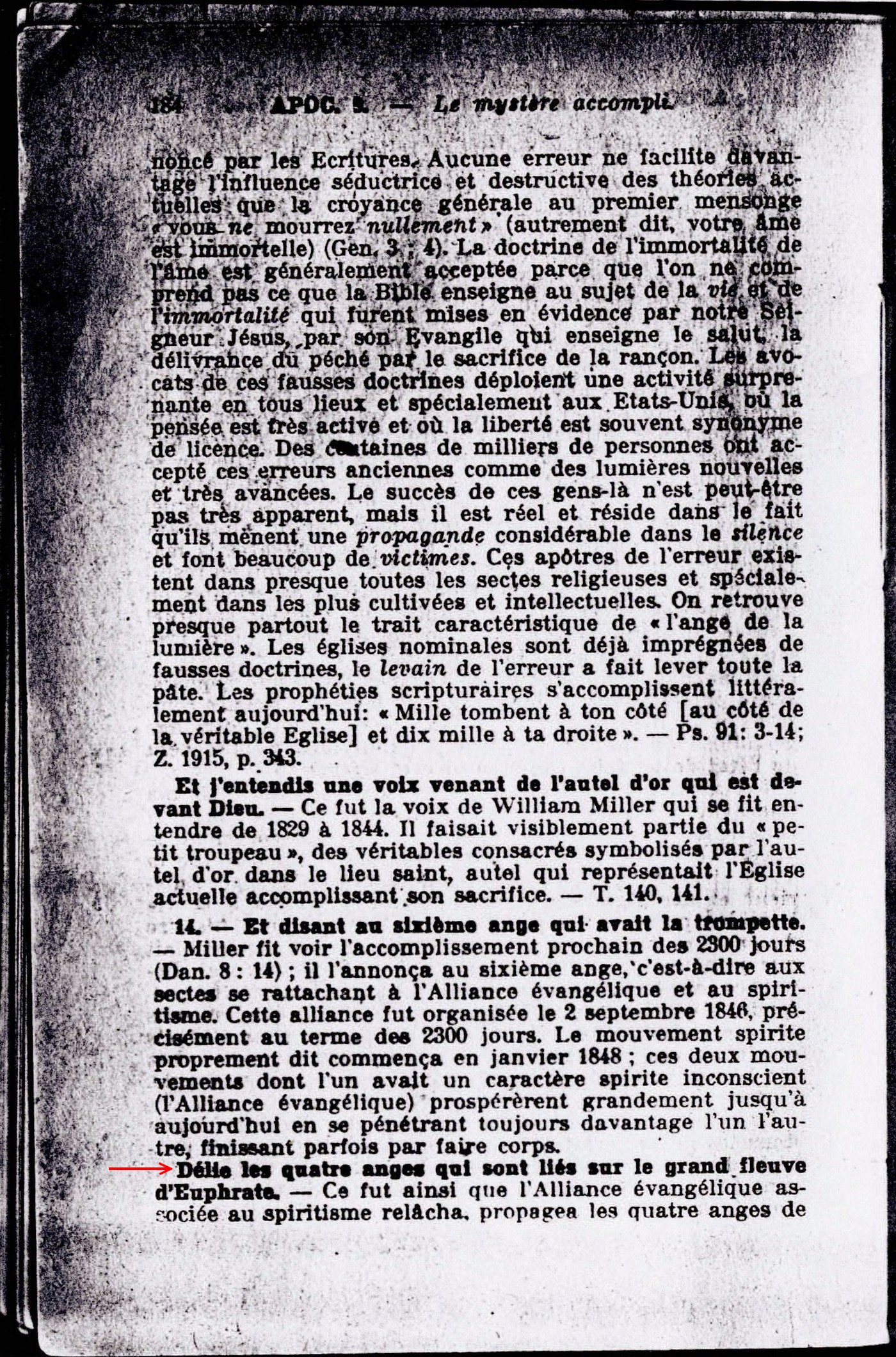 Délie les quatres anges qui sont liés sur le grand fleuve d'Euphrate - Ce fut ainsi que l'Alliance évangélique associée au spiritisme relâcha, propagea les quatres anges de l'erreurs ci-après. Voici ces quatre messager ou erreurs fondamentales : (1) "L'unité de la divinité et la trinité des personnes qui la forment."... (2) "L'incarnation du Fils de Dieu" (3) "L'immortalité de l'âme." (4) "L'institution divine du pastorat ou ministère chrétien", c'est-à-dire la formation d'un clergé. Ces quatres erreurs font partie des neufs principes fondamentaux de ,l'Alliance évangélique; [...] Alors furent déliés les quatre anges qui étaient préparés. - Les quatres grandes erreurs de la trinité, de l'incarnation de l'immortalité de l'âme et de l'esprit de domination ou esprit ecclésiastique, eurent une plus grande liberté d'action qu'antérieurement et amenèrent la préparation de chaque secte en son propre temps pour l'issue finale qui allait survenir. Source : 🇫🇷 1917 - Le Mystère Accompli, page 184, page 185 + Cover |