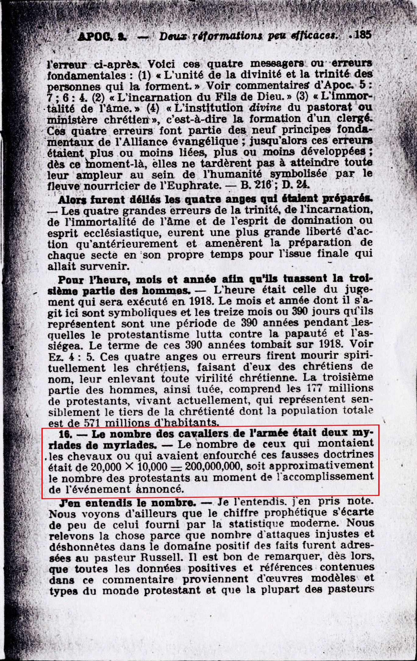 16. - Le nombre des cavaliers de l'armée était deux myriades de myriades. - Le nombre de ceux qui montaient les chevaux ou qui avaient enfourché ces fausses doctrines était de 20 000 X 10 000 = 200 000 000, soit appoximativement le nombre des protestants au moment de l'accomplissement de l'événement annoncé. Et ceux qui les montaient, ayant des cuirasses de feu, d'hyacinthe et de soufre. - Tous ces cavaliers sont la presque totalité du monde protestant. Source : 🇫🇷 1917 - Le Mystère Accompli, page 185, page 186 + Cover |