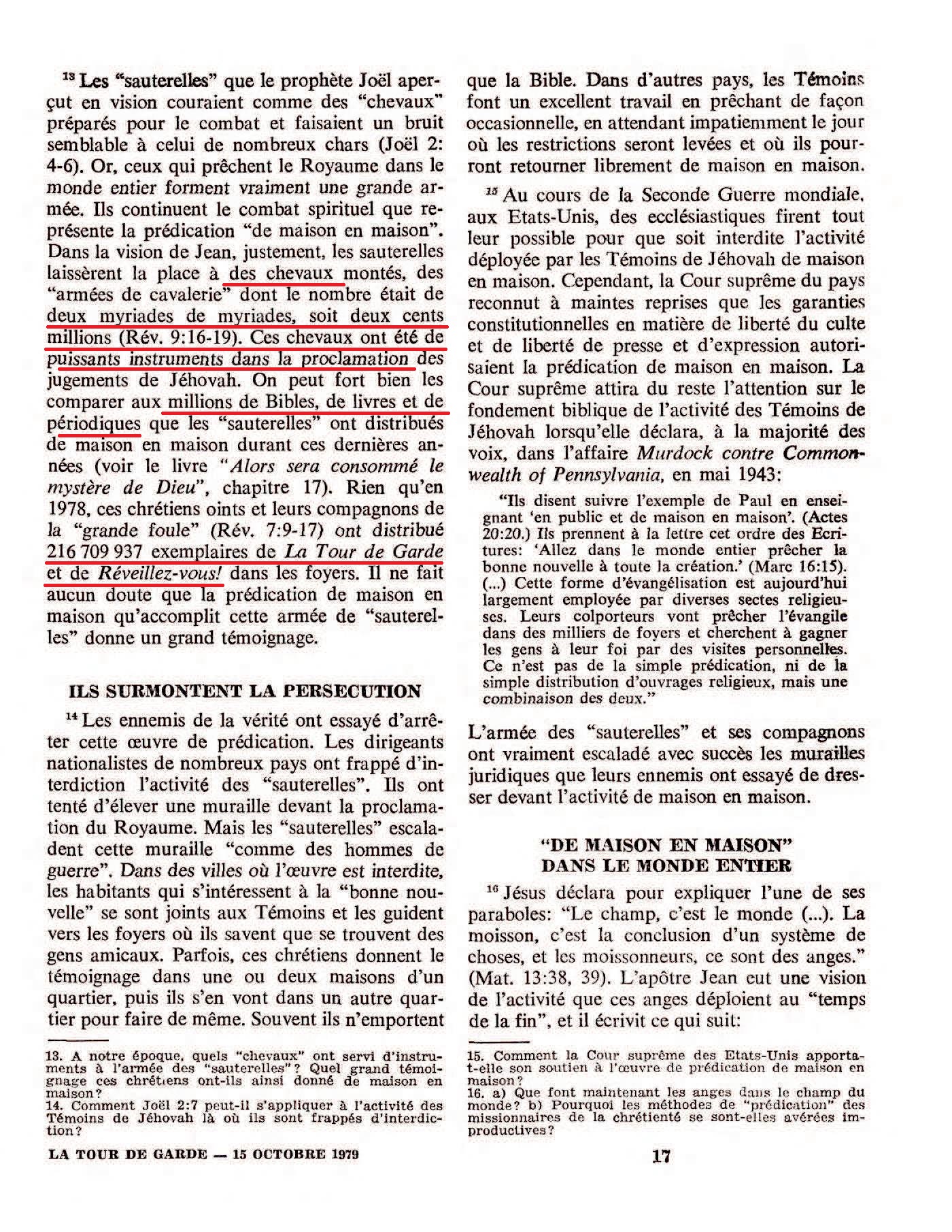 Or, ceux qui prêchent le Royaume dans le monde entier forment vraiment une grande armée. Ils continuent le combat spirituel que représente la prédication “de maison en maison”. Dans la vision de Jean, justement, les sauterelles laissèrent la place à des chevaux montés, des “armées de cavalerie” dont le nombre était de deux myriades de myriades, soit deux cents millions (Rév. 9:16-19). Ces chevaux ont été de puissants instruments dans la proclamation des jugements de Jéhovah. On peut fort bien les comparer aux millions de Bibles, de livres et de périodiques que les “sauterelles” ont distribués de maison en maison durant ces dernières années (voir le livre “Alors sera consommé le mystère de Dieu”, chapitre 17). Rien qu’en 1978, ces chrétiens oints et leurs compagnons de la “grande foule” (Rév. 7:9-17) ont distribué 216 709 937 exemplaires de La Tour de Garde et de Réveillez-vous! dans les foyers.