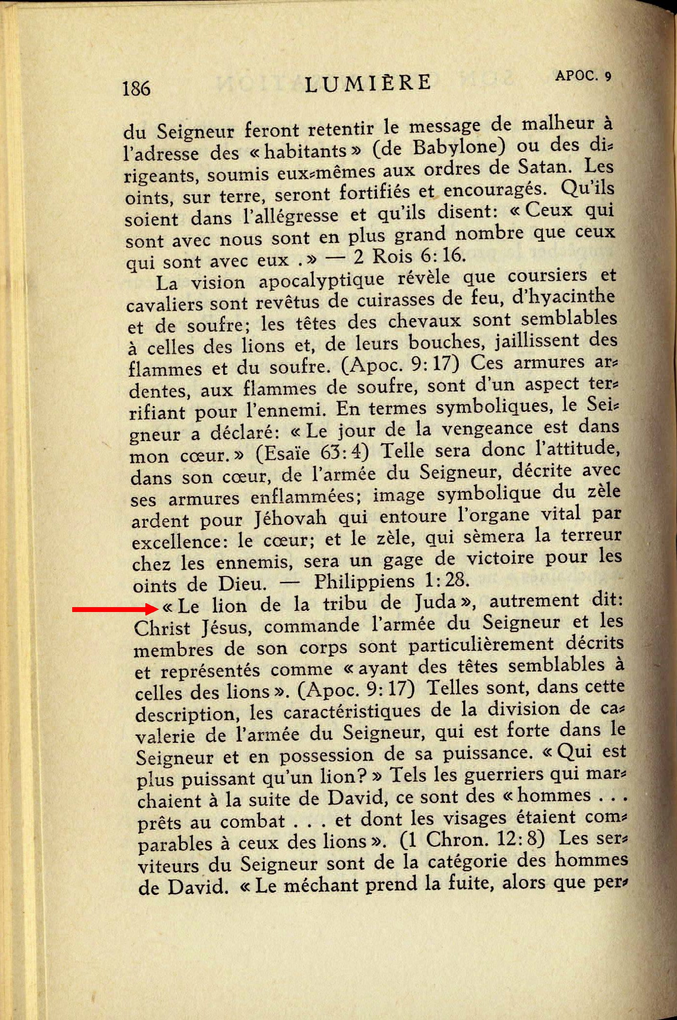 "Le lion de la tribu de Judas", autrement dit: Christ Jésus, commanda l'armée du Seigneur et les membres de son corps sont particulièrement décrits et représentés comme "ayant des têtes semblable à celles des lions". (Apoc. 9:17) Telles sont, dans cette description, les caractéristiques de la division de cavalerie de l'armée du Seigneur, qui est forte dans le Seigneur et en possession de sa puissance. "Qui est plus puissant qu'un lion?" Tels les guerriers qui marchaient à la suite de David, ce sont des "hommes... prêts au combat... et dont les visages étaient comparables à ceux des lions". (1 Chron. 12:8) Les serviteurs du Seigneur sont de la catégorie des hommes de David.