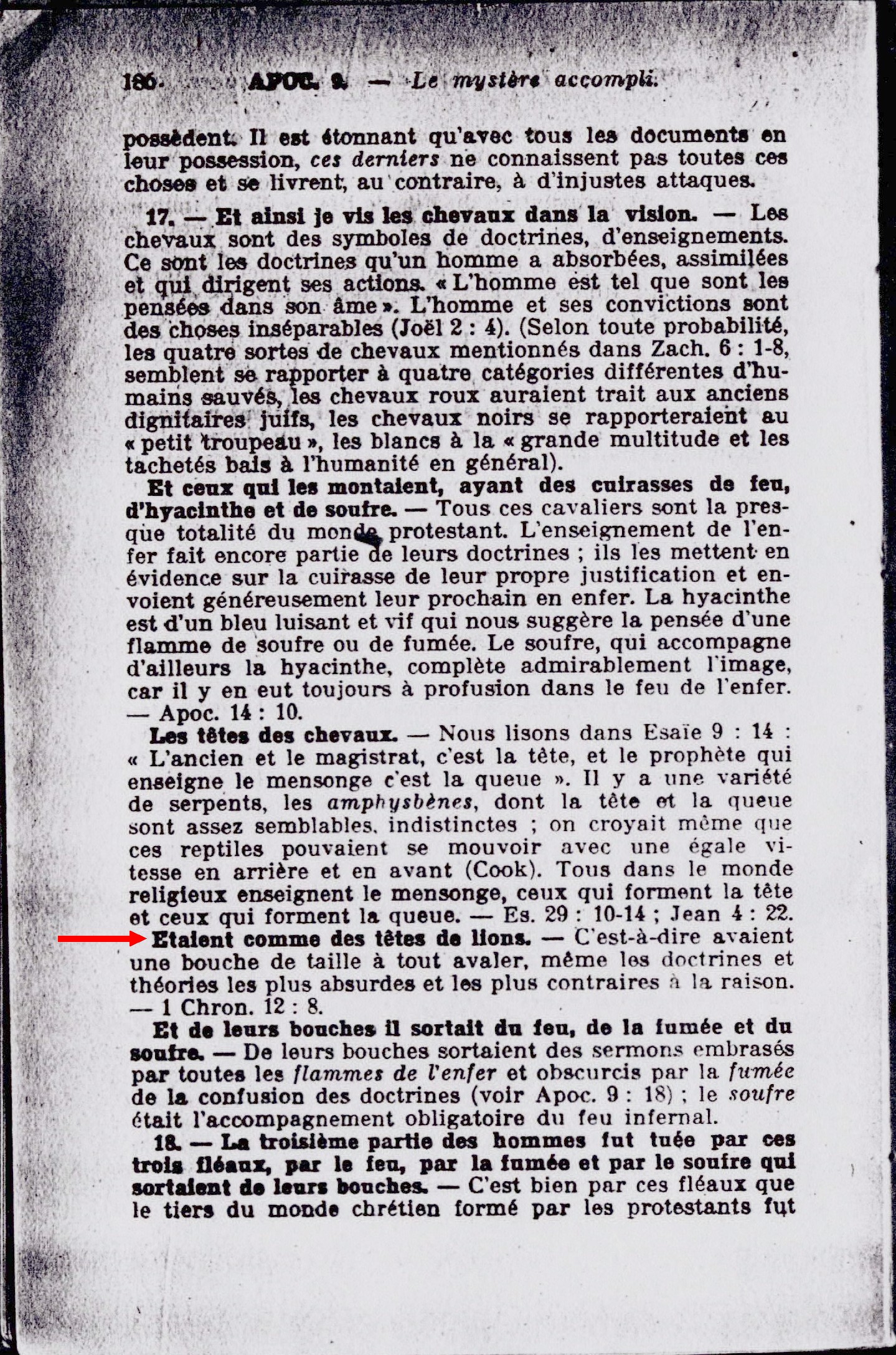 Etaient comme des têtes de lions. - C'est-à-dire avaient une bouche de taille à tout avaler, même les doctrines et théories les plus absurdes et les plus contraires à la raison. - 1 Chron. 12:8. Source : 🇫🇷 1917 - Le Mystère Accompli, page 186 + Cover |