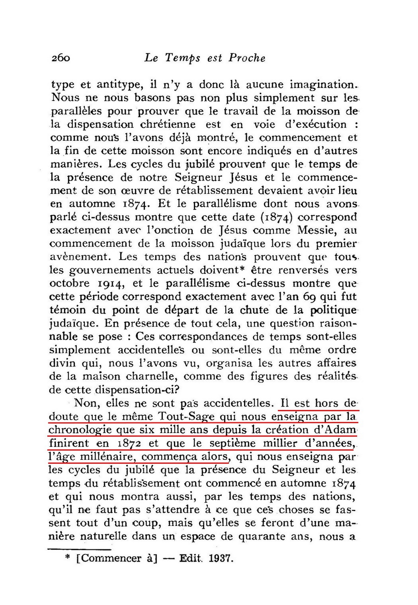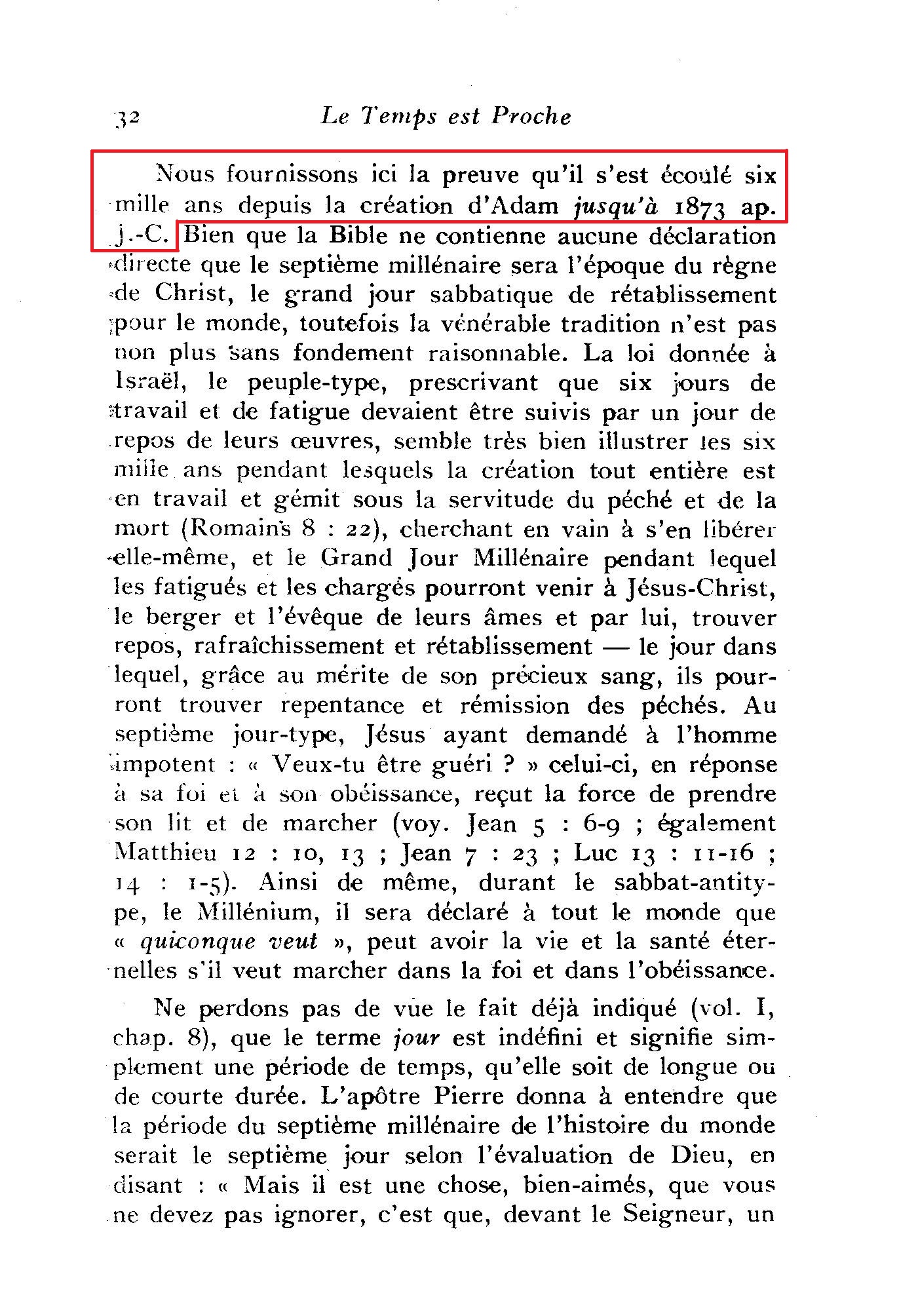 Il est hors de doute que le même Tout-Sage qui nous enseigna par la chronologie que six mille ans depuis la création d'Adam finirent en 1872 et que le septième millier d'années, l'âge millénaire, commença alors,