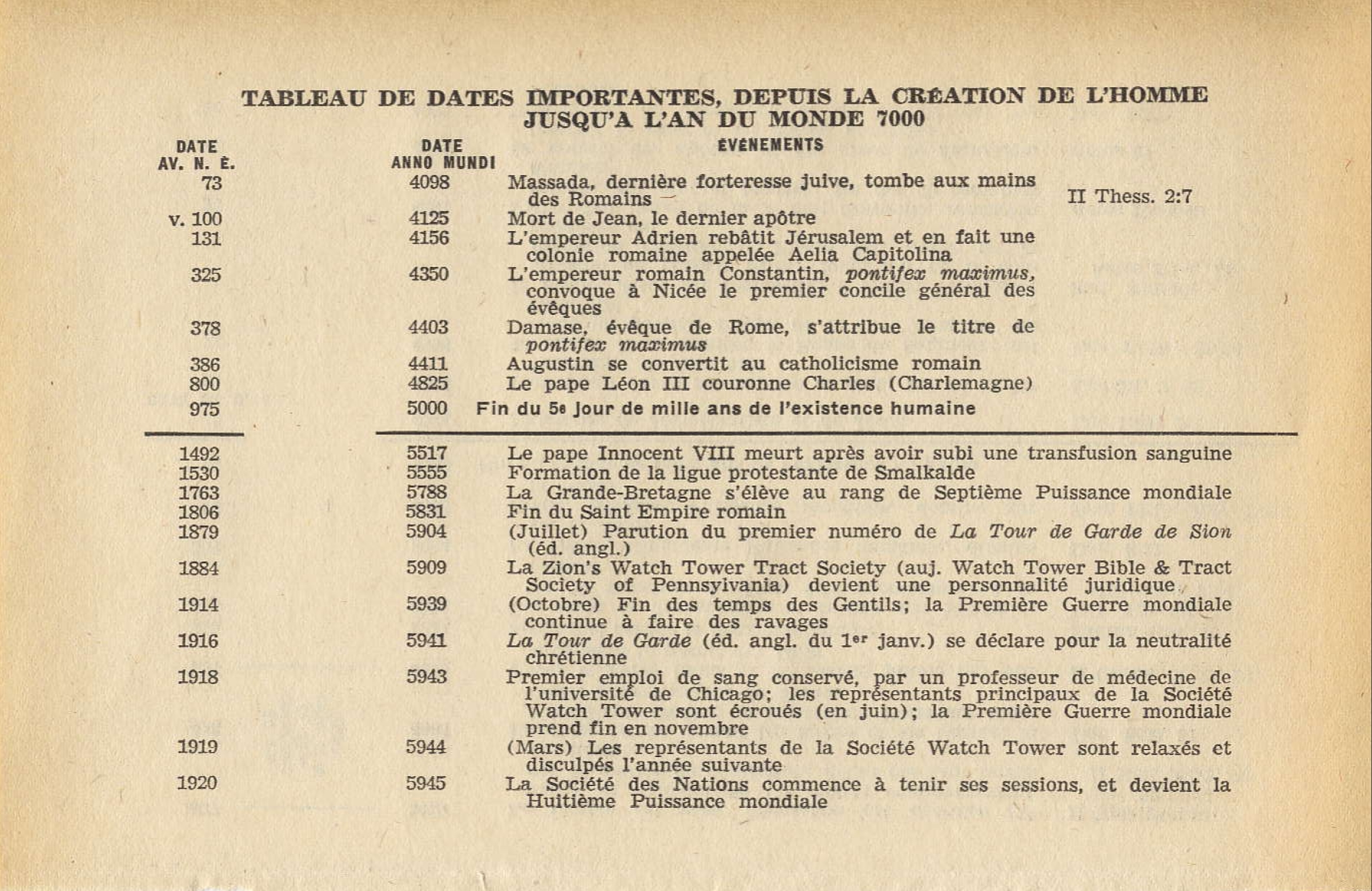 Or, cette chronologie indépendante, déjà publiée, situe la création de l'homme en 4026 av. notre ère. D'après cette chronologie biblique digne de foi, en 1975 six mille années se seront écoulées depuis la création de l'homme, et le septième milléniare de l'histoire humaine commencera en automne 1975...Dans quelques années donc, au cours de notre génération, nous arriverons à ce que Jéhovah Dieu pourrait considérer comme le septième jour de l'existence de l'homme...Combien il serait opportun si Jéhovah Dieu faisait du septième millénaire qui va bientôt commencer un sabbat de repos et de remise, un grand sabbat jubilaire, où la liberté serait proclamée par toute la terre et parmi tous ses habitant! ... Ce ne serait pas par hasard ou fortuitement, mais ce serait en accord avec le dessein bienveillant de Jéhovah Dieu, si le règne de Jésus-Christ, le "Seigneur du sabbat" devait avoir lieu parallèlement au septième millénaire de l'existence humaine.. Le jour béni de son inauguration est maintenant très proche. Sous peu, dans notre génération, la trompette symbolique sonnera par la puissance divine, annonçant "la liberté dans le pays pour tous ses habitants.