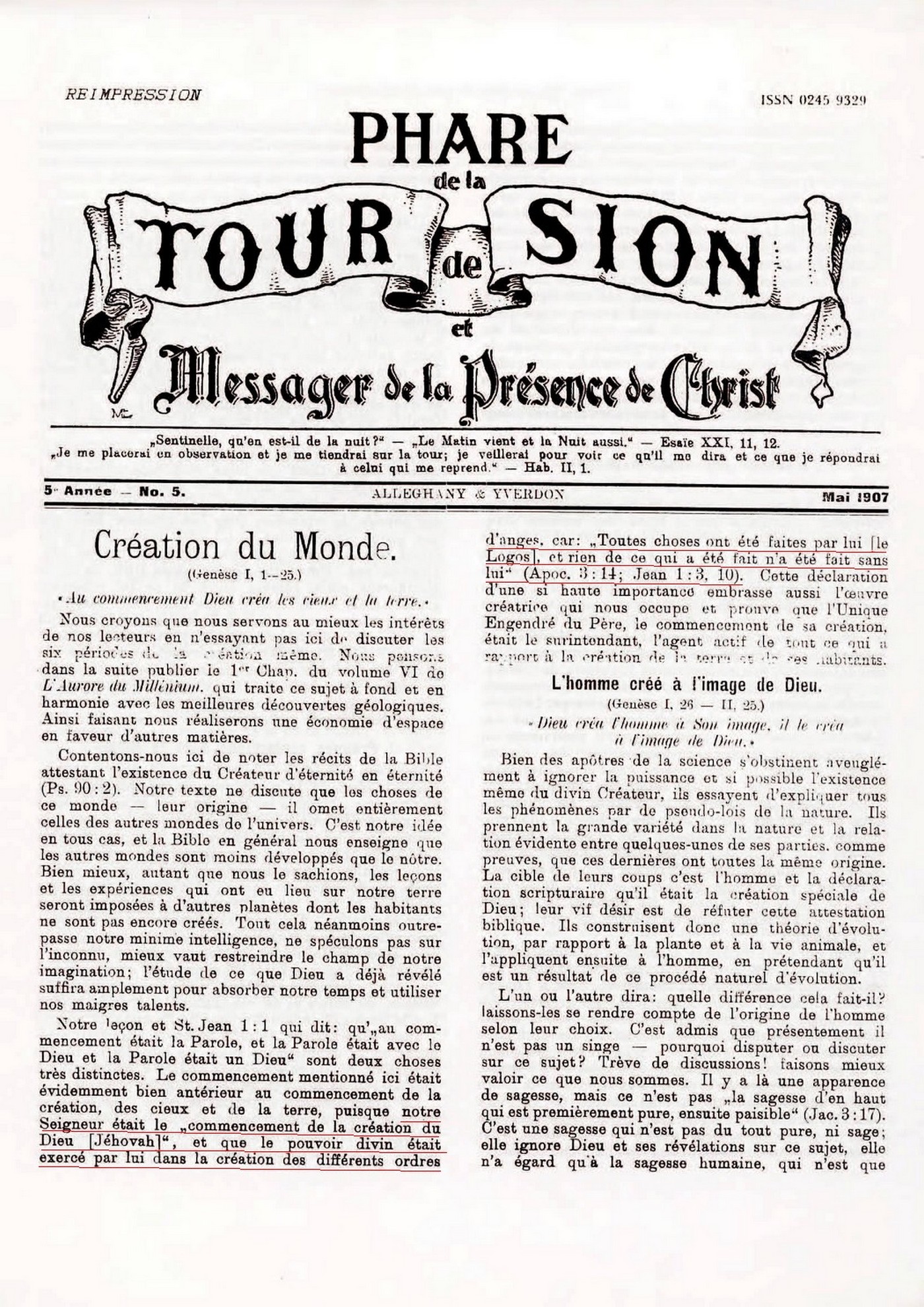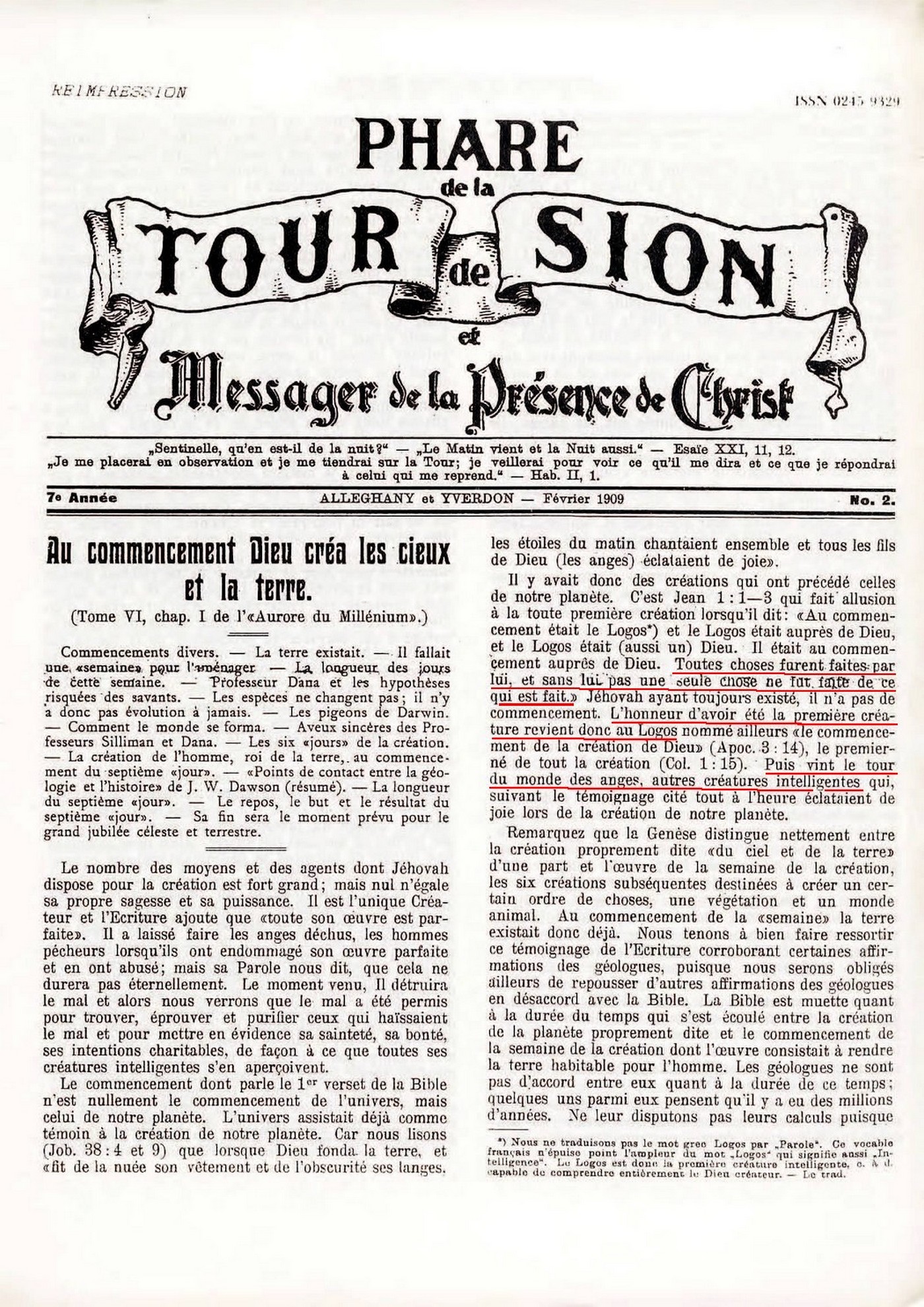 notre Seigneur était le "commencement de la création du Dieu [Jéhovah]", et que le pouvoir divin était exercé par lui dans la création des différents ordres d'anges, car: "Toutes choses ont été faites par lui [le Logos], et rien de ce qui a été fait n'a été fait sans lui" (Apoc. 3:14; Jean 1:3, 10).