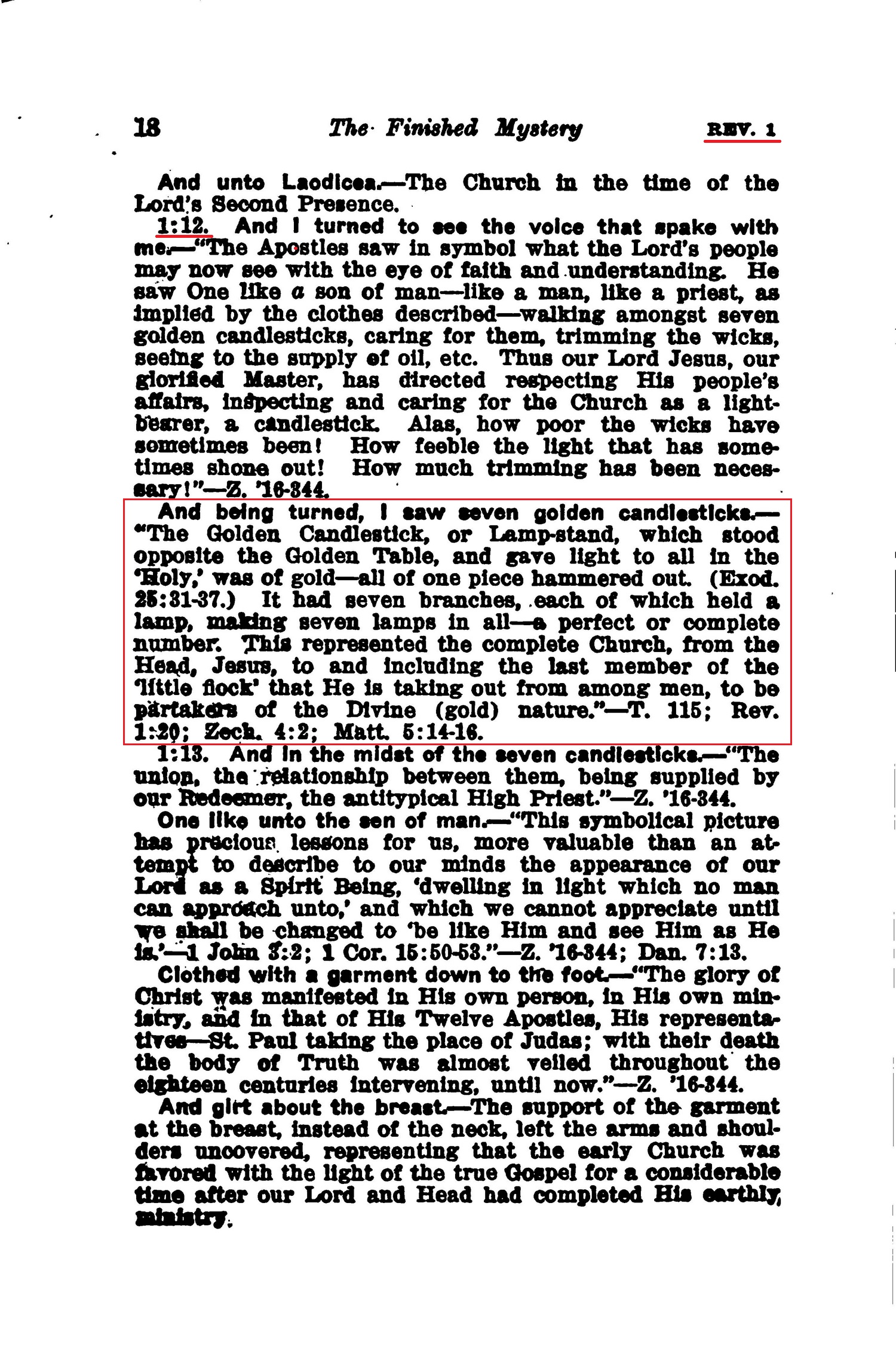 And the seven golden candlesticks.—"The Candlestick, or Lampstand, represents the nominal, rather than the true Church. This is shown hy the fact that in addressing each of these churches the Lord finds fault with the many and approves the faithful few." —Z.'16-344. Source : 🇺🇸 1917-1923 - Studies in the Scriptures, Vol 7, The finished mystery, page 22 + Cover |